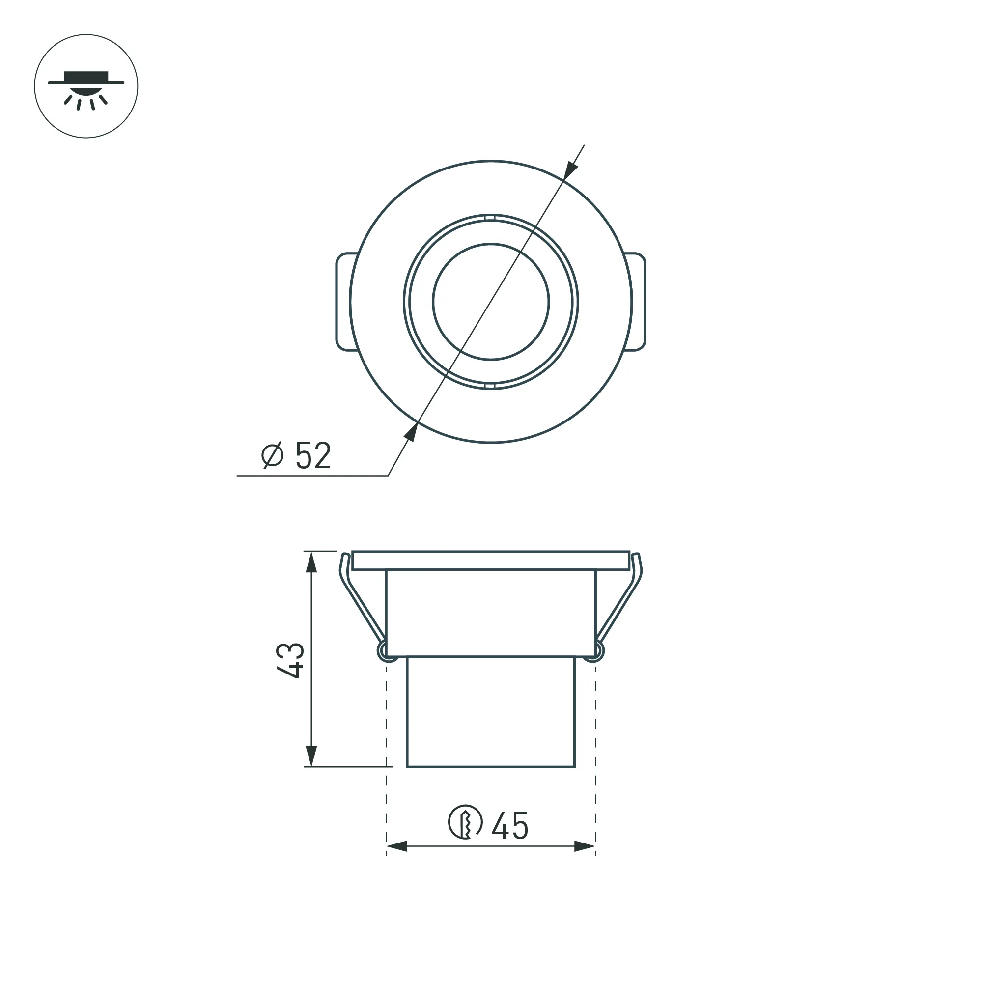 Врезной круглый мебельный светильник 3Вт, корпус белый алюминий. Цвет ТЁПЛЫЙ БЕЛЫЙ 2700-3000K. Светодиод 1х3W CREE XPE. Св.поток 140-160лм, наклоняемая ось, угол 30°. Питание 180-240VAC, 3Вт, 700mA 3-5V, драйвер в комплекте. Размеры d52x43 мм, врезное отверстие d45 мм.