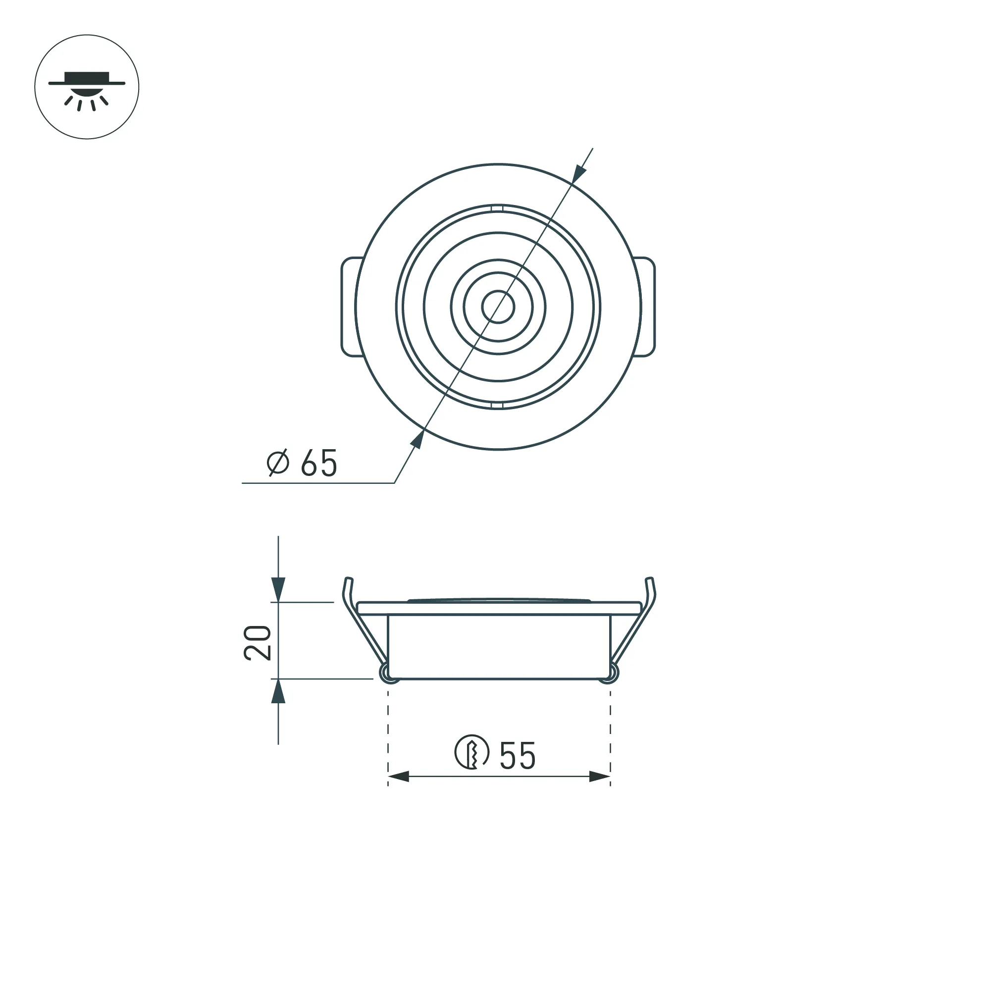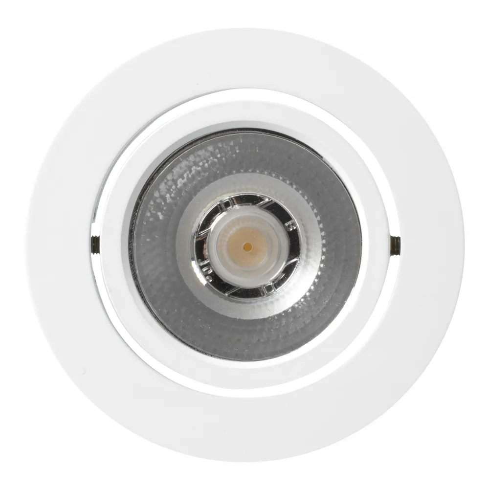 Врезной круглый мебельный светильник 5Вт, корпус белый алюминий. Цвет ДНЕВНОЙ БЕЛЫЙ 4000K. Светодиод 1х5W Bridgelux. CRI>80, Св.поток 350-400лм, наклоняемая ось, угол 10°. Питание 180-240VAC, 5Вт, 400mA 11-13V, драйвер в комплекте. Размеры d65x20 мм, врезное отверстие d55 мм.