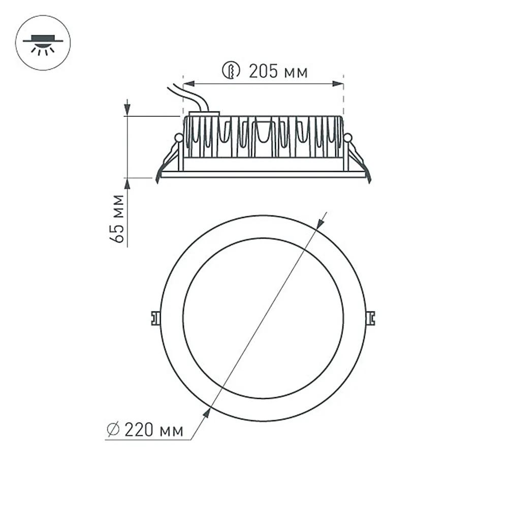 Встраиваемый круглый светильник, угол 110° / 30Вт / БЕЛЫЙ 6000K / светодиод 1x30W / 2700 лм, CRI>80. Белая лицевая панель. IP44. Питание AC180-240V, 30Вт, 700mA 39-47V, драйвер в комплекте. Размеры DxH: 220х65мм, отверстие для установки 205мм.