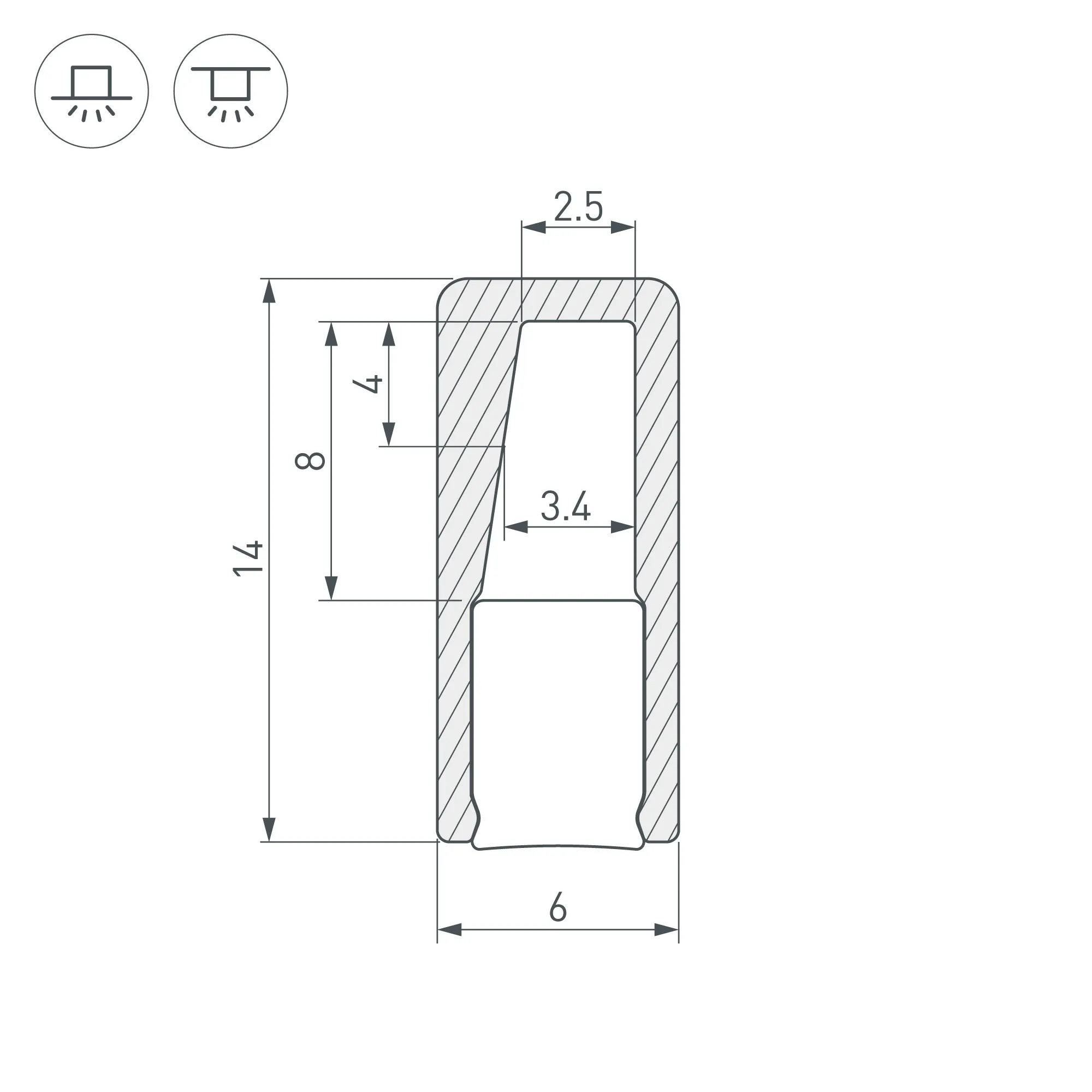 Комплект с гибким силиконовым экраном. Алюминиевый анодированный профиль для светодиодных лент и линеек. Габаритные размеры (L×W×H): 2000x6x14 мм. Ширина площадки для ленты 8 мм. Аксессуары приобретаются отдельно.