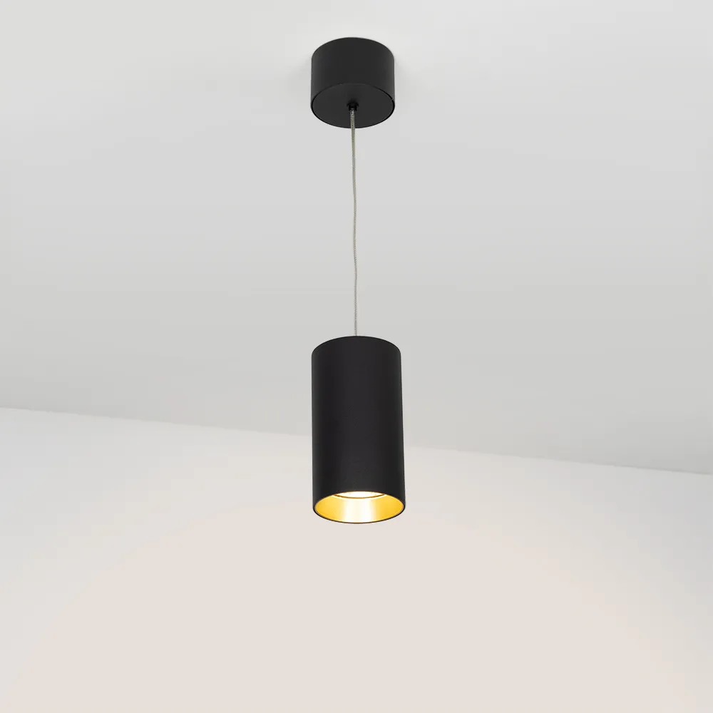 Подвесной светильник 15Вт, черный круглый корпус, золотистая вставка, металл. Цвет ТЕПЛЫЙ БЕЛЫЙ 3000K, св.поток 1100лм, CRI(Ra)>80, угол 40°. Размер Ø85x155мм. Встроенный драйвер PRI:220-240VAC, SEC:DC 500mA 23-36V 15Вт.