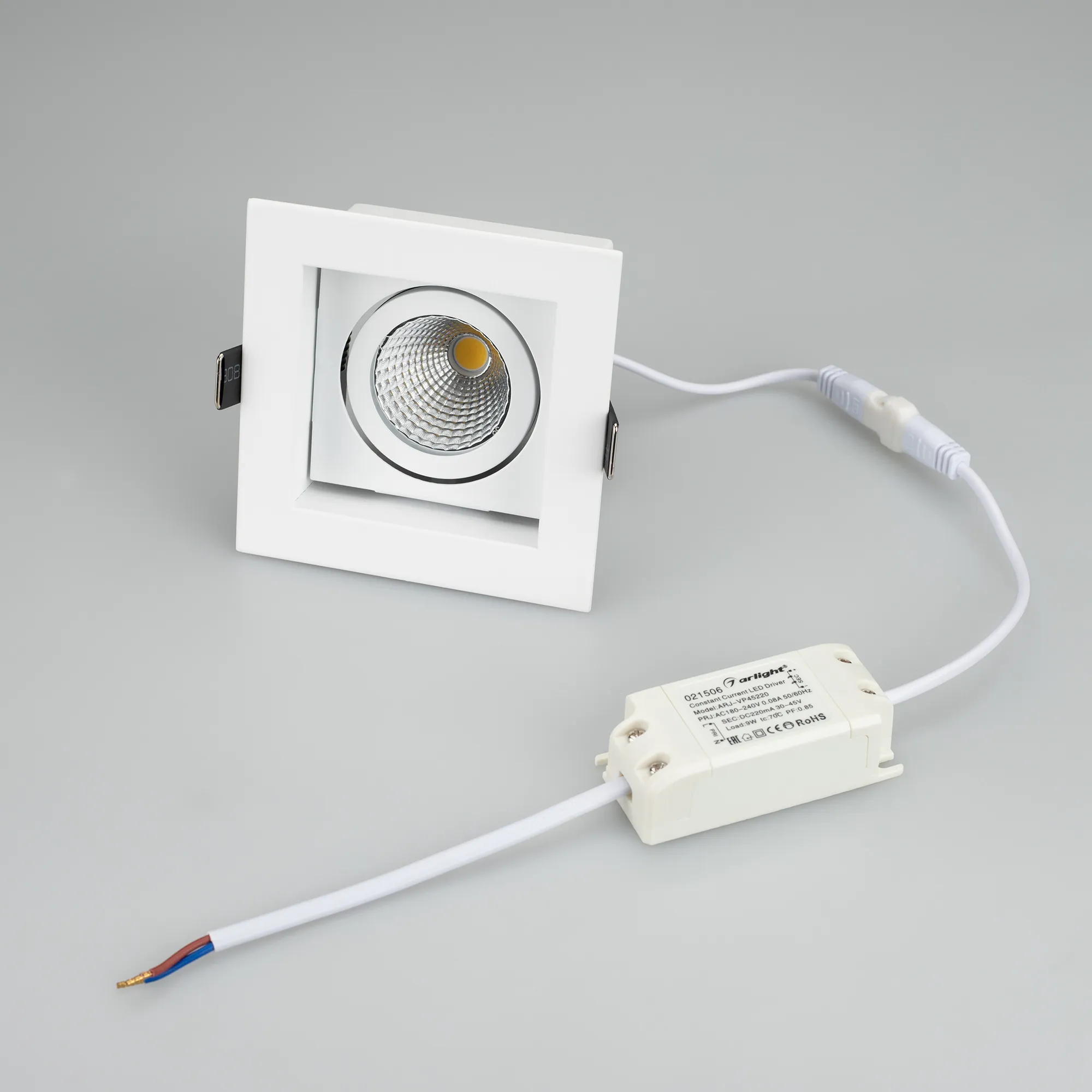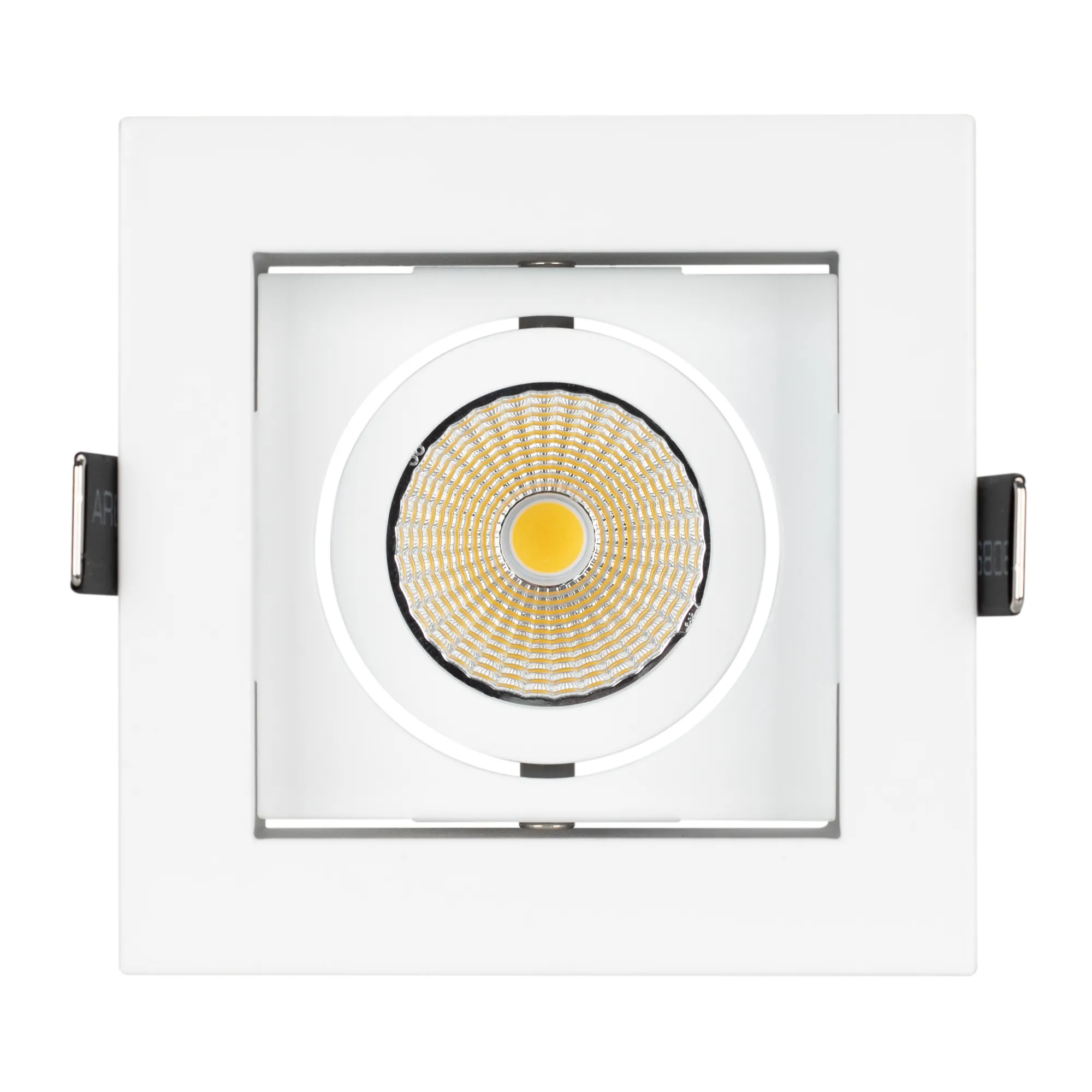 Встраиваемый карданный светильник. Угол 38° / 9Вт / ДНЕВНОЙ БЕЛЫЙ 4000K / 680лм, CRI>80. Корпус из белого алюминия. Питание AC180-240V, 9Вт, в комплекте драйвер 200mA 30-45V. Размеры LxWxH: 102х102x85мм, отверстие для установки 85x85мм.
