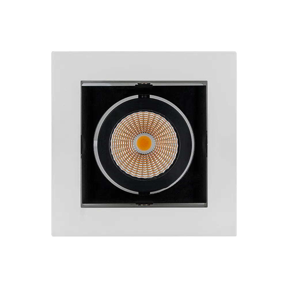 Встраиваемый карданный светильник. Угол 38° / 9Вт / ТЕПЛЫЙ БЕЛЫЙ 3000K / 680лм, CRI>80. Корпус из белого алюминия с черными вставками. Питание AC180-240V, 9Вт, в комплекте драйвер 200mA 30-45V. Размеры LxWxH: 102х102x85мм, отверстие для установки 85x85мм.