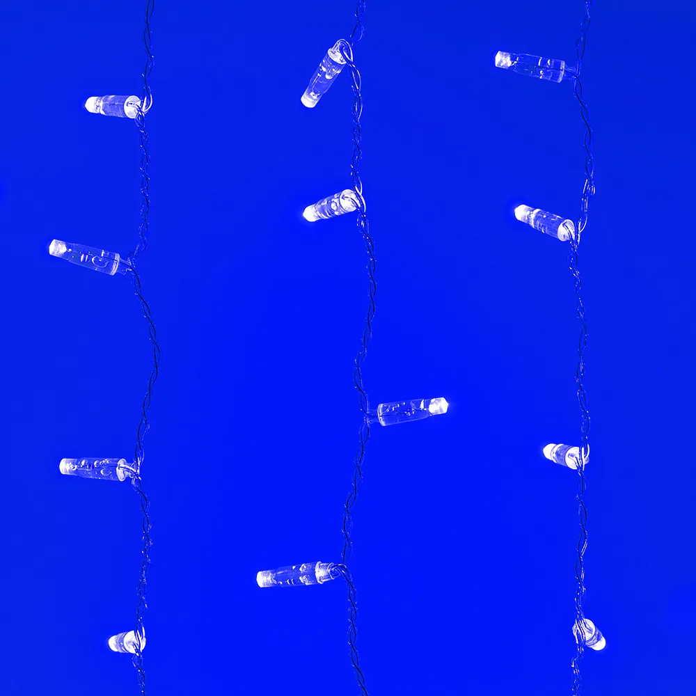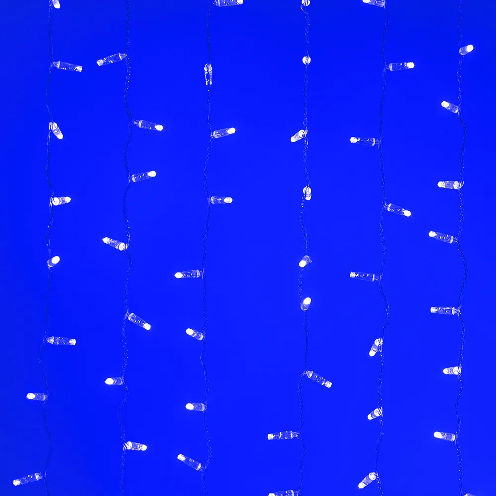 Светодиодный Занавес Classic. Размер 2000x1500 мм (длина 2000 мм, высота 1500 мм). 20 ниспадающих нитей длиной 1500 мм. 360 светодиода размером 7 мм. Цвет свечения СИНИЙ, постоянное свечение и 8 динамических эффектов с резким световым рисунком (прозрачная вогнутая линза). Провод прозрачный, ПВХ. Питание 230 В, Мощность 60 Вт, защита IP65, применение в помещении и на улице под навесом. Аксессуар для подключения и выбора режима свечения в комплекте.