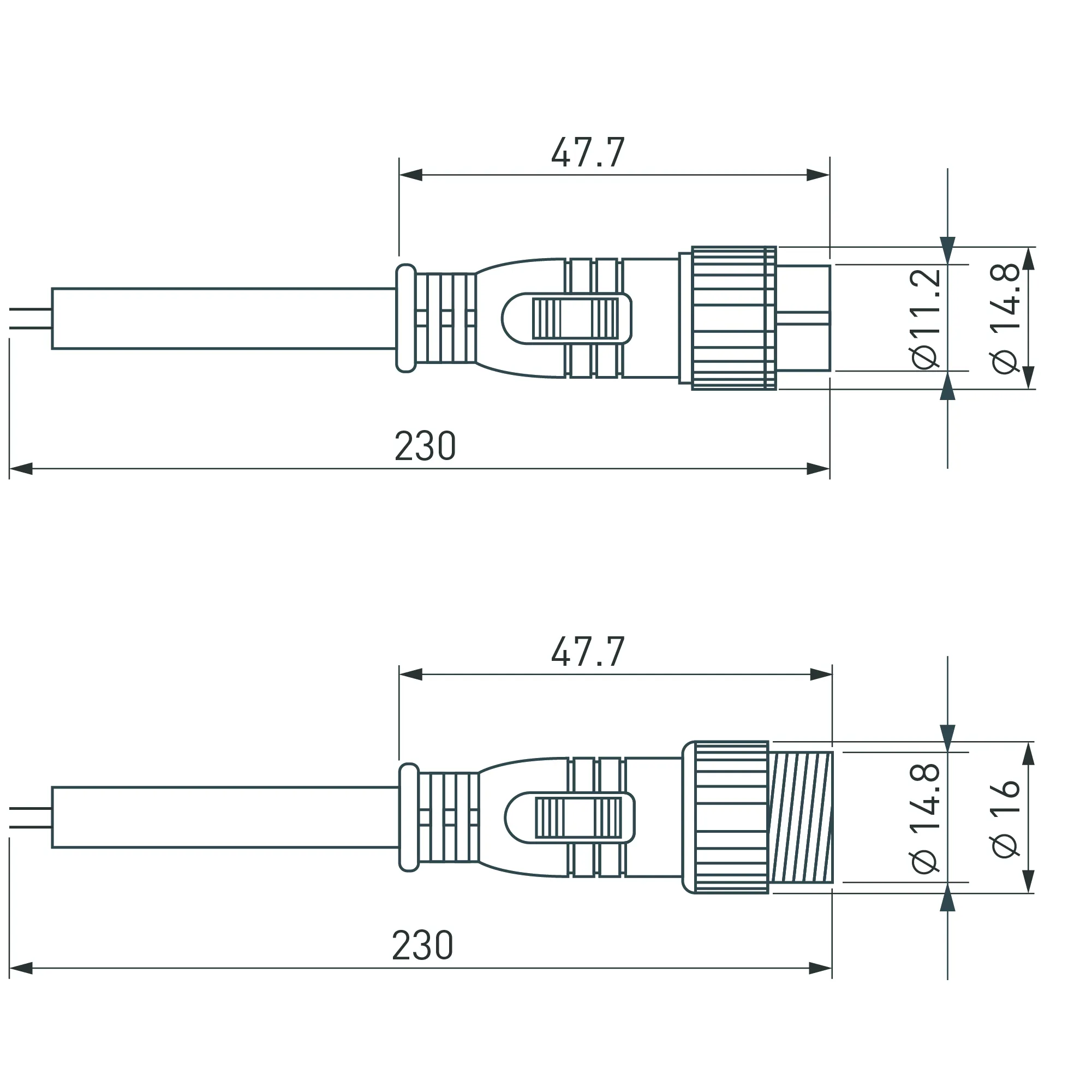 Коннектор питания для светодиодных прожекторов серии LINE. Предназначен для подключения питания DC24V. Габариты разъёма DxH - Ø18х48мм, длина разъёма с проводом L=230мм.