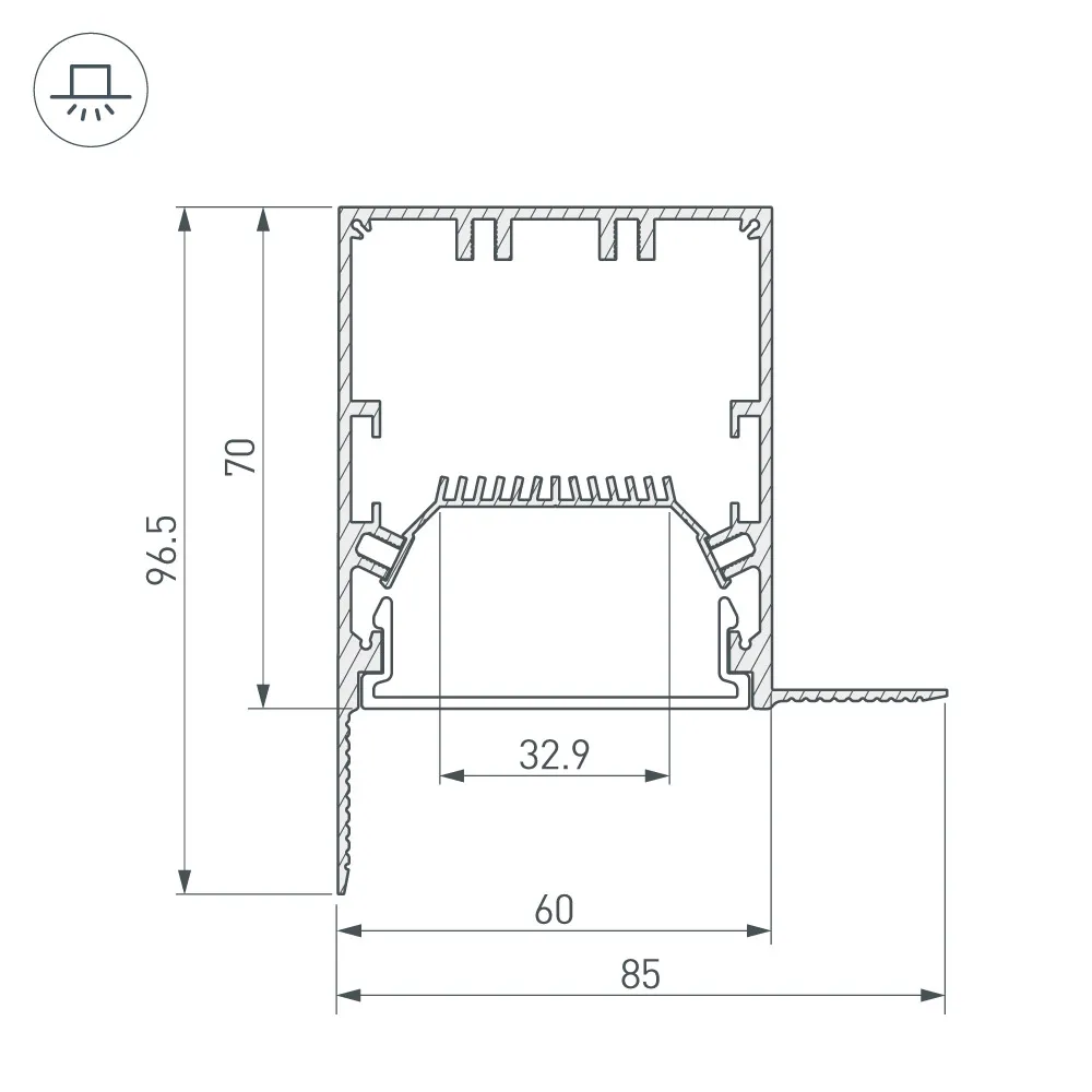 Под заказ от 500м. Алюминиевый анодированный профиль для светодиодных лент и линеек, с отсеком для блока питания (размер отсека 48x30 мм). Габаритные размеры (L×W×H): 2000x85x96,5 мм. Паз для установки 70х60 мм. Ширина площадки для ленты 32,9 мм. Экраны, заглушки и другие аксессуары приобретаются отдельно. Цена за 1 метр.