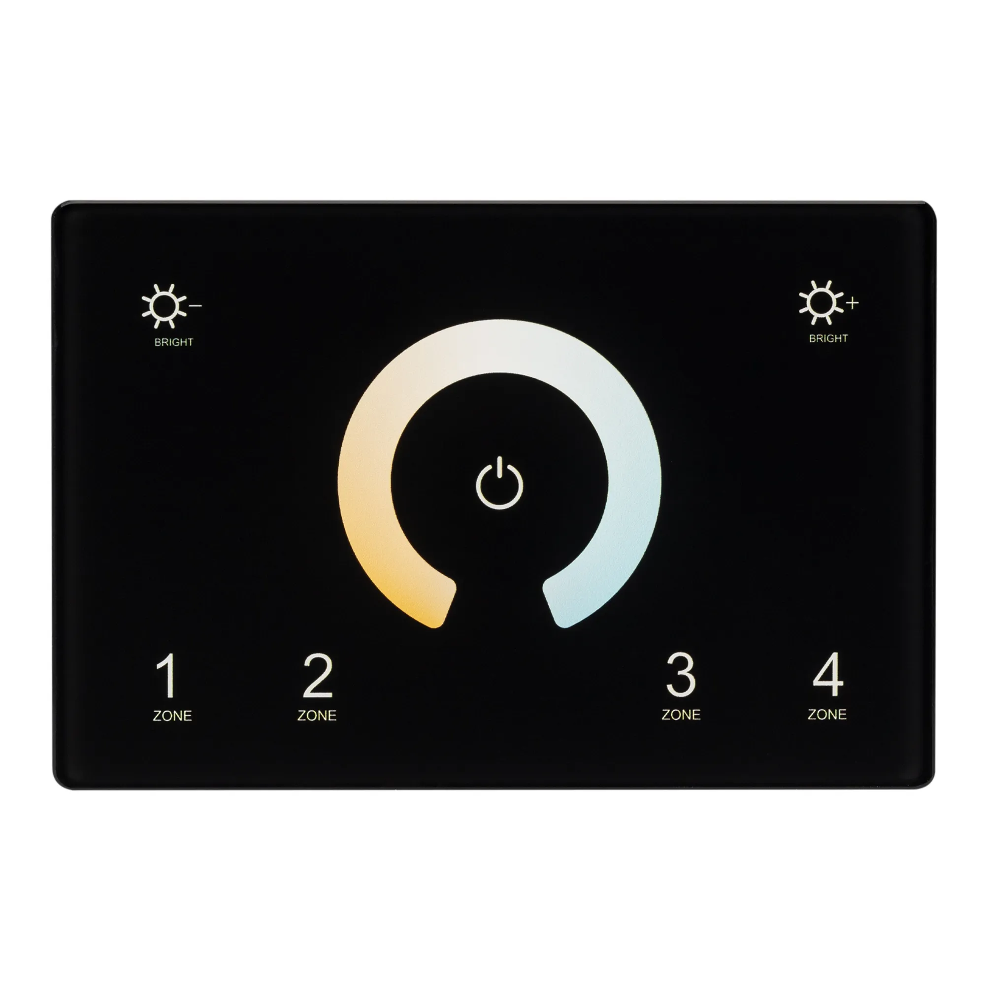 Встраиваемая сенсорная панель 2.4 ГГц, цвет чёрный. Итальянский стандарт. Материал - стекло. Для управления мультибелыми (MIX/CCT) источниками света (ШИМ), 4 зоны управления. Функция управления DMX512 устройствами. Питание/рабочее напряжение AC 85-265V. Габариты 120х80х37 мм, устанавливается в стандартный подрозетник. Панель совместима с контроллерами серии SMART.