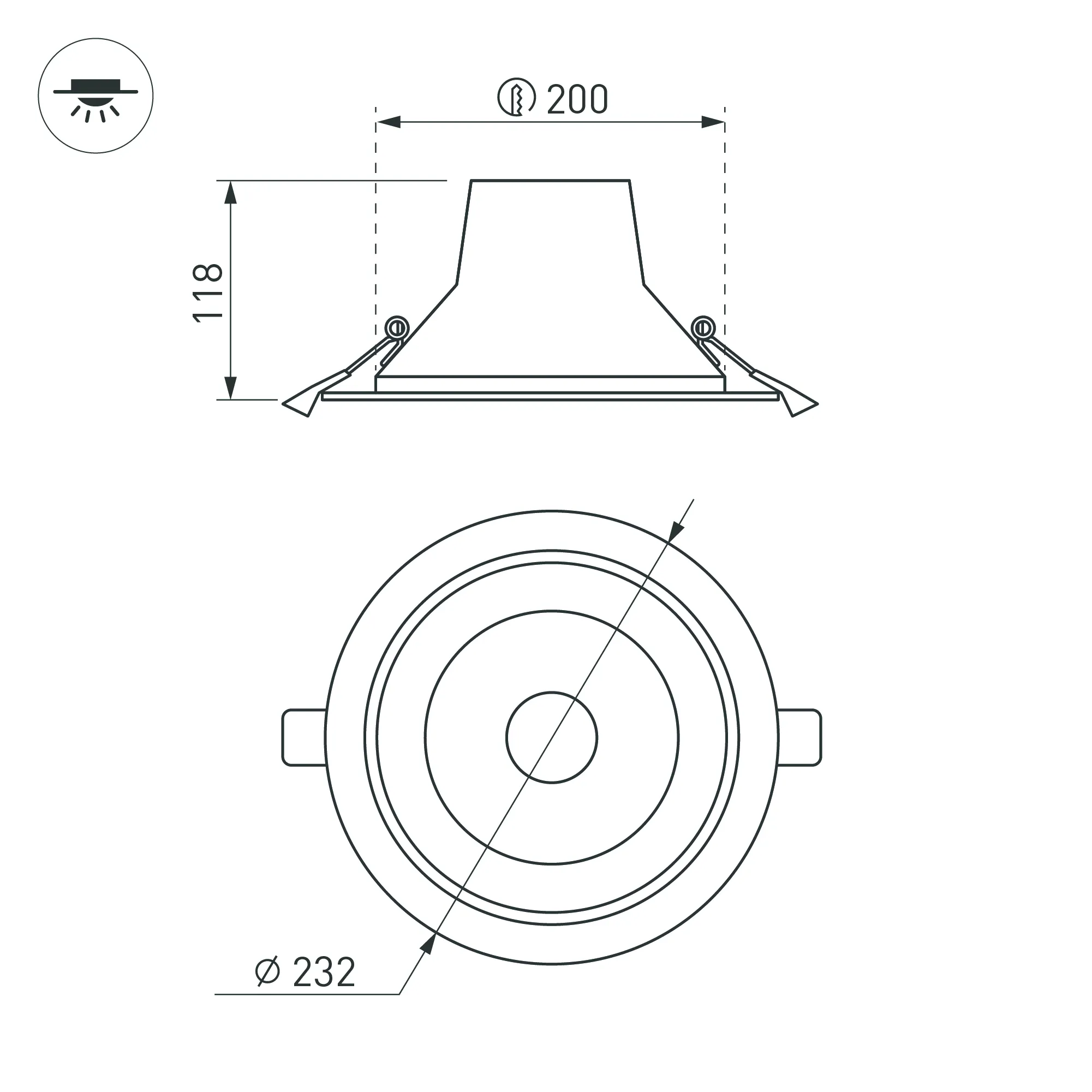 Встраиваемый светильник "Даунлайт" 35Вт. Цвет свечения ДНЕВНОЙ 4000К. Световой поток 3150лм, угол 50°, CRI>80. Белый корпус. Питание AC220-240V. Габариты: Ø232х118мм, врезное отверстие Ø195-210мм. Драйвер в комплекте (26.5-44.5V, 900mA).