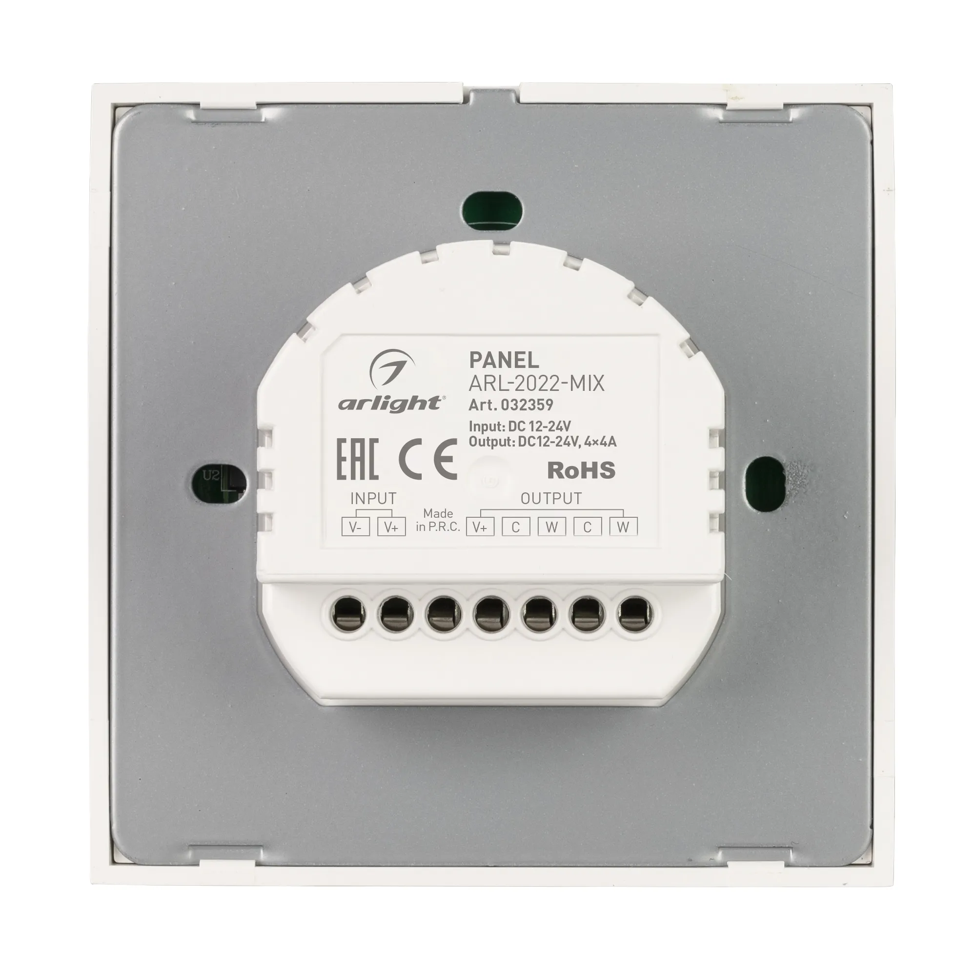 Встраиваемая сенсорная панель (Европейский стандарт) для управления MIX светодиодными лентами, цвет белый. 4 канала (2 пары параллельных каналов), питание DC 12-24V, ток нагрузки 4x4A, мощность нагрузки 192-384W. Габариты 86х86х33 мм.