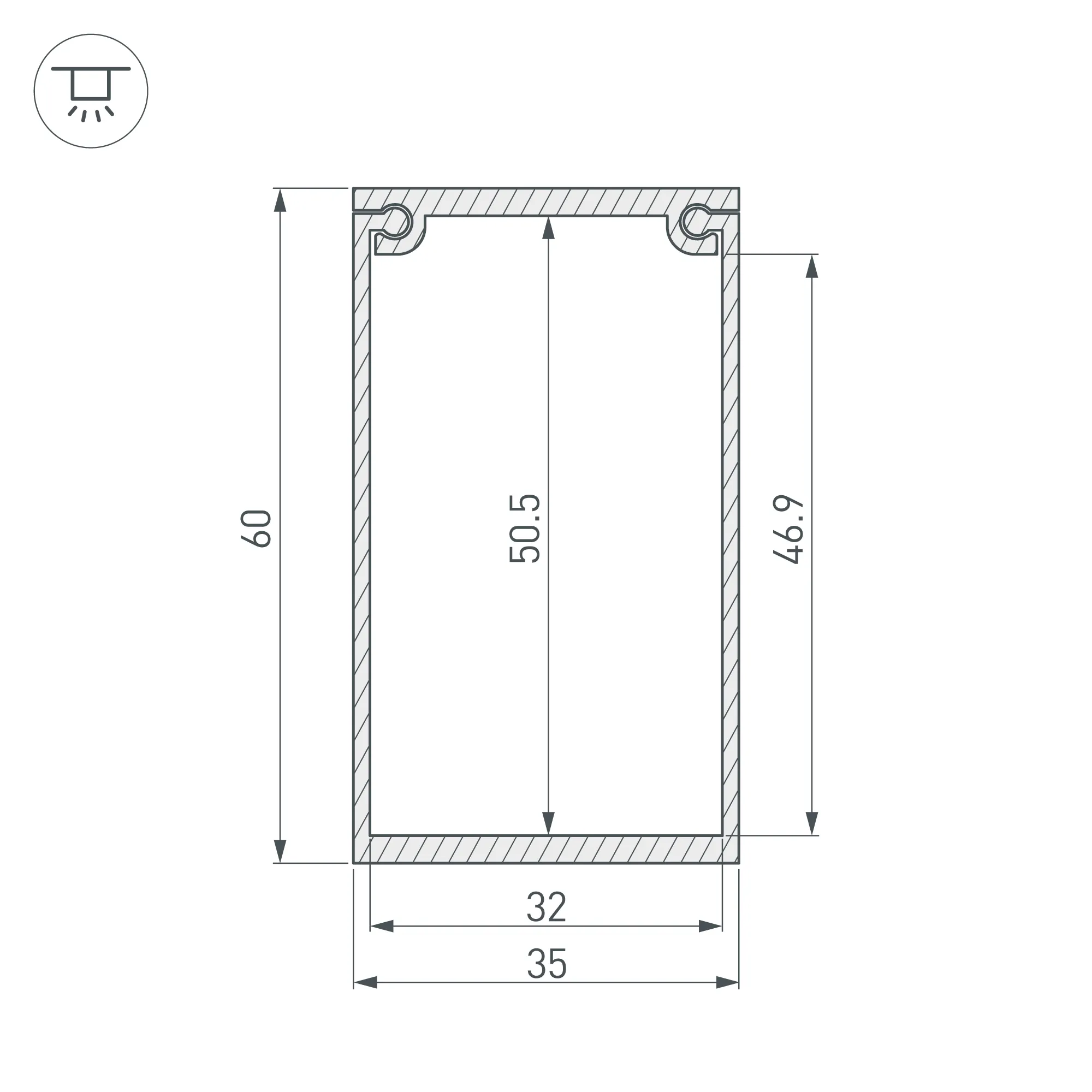 Внутренние размеры: 567×32×46.9мм. Внешние размеры: 570×35×60мм.