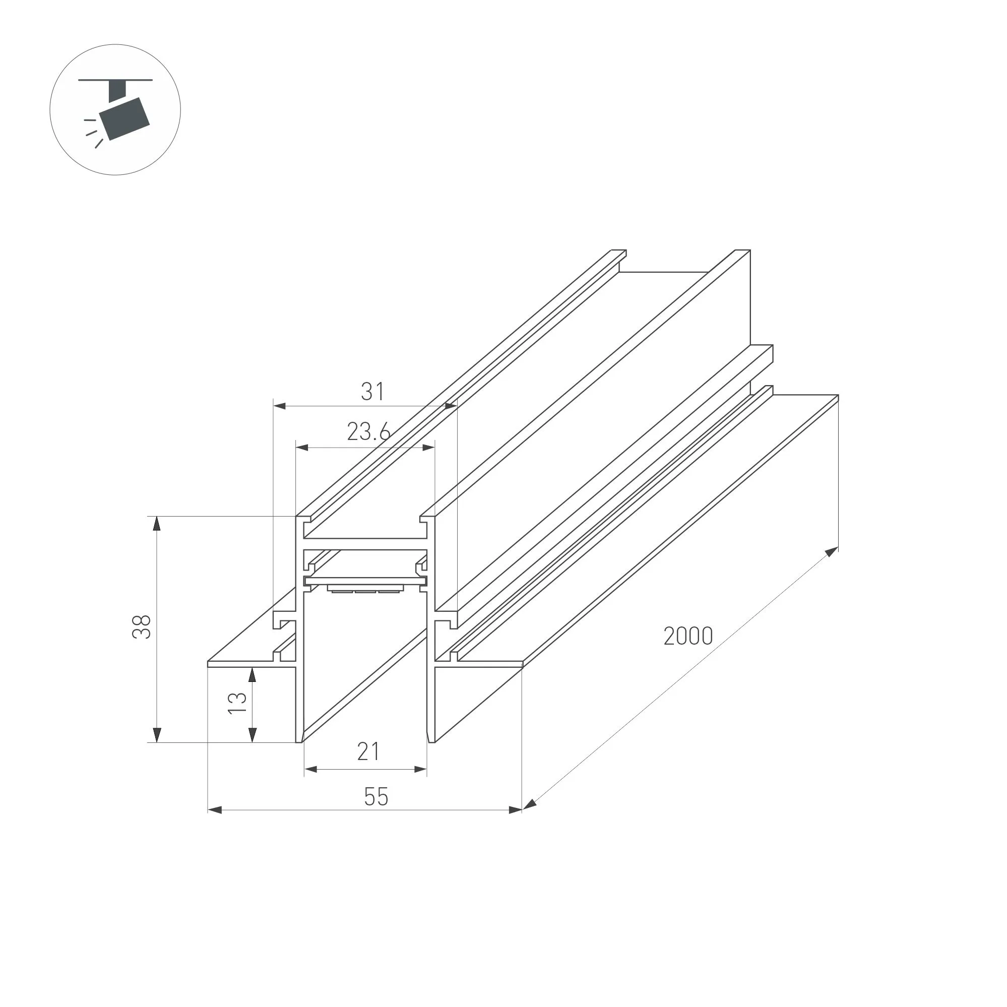 Встраиваемый магнитный трек с фланцем для монтажа в гипсокартонный потолок, длина 2000 мм. DC24V. Материал алюминий, цвет черный. Две заглушки в комплекте. Размер ДxШxВ: 2000x55x38 мм. Размер (с учетом заглушек и фланцев) ДxШxВ: 2003x55x38 мм. DC24V. Аналог 046285.