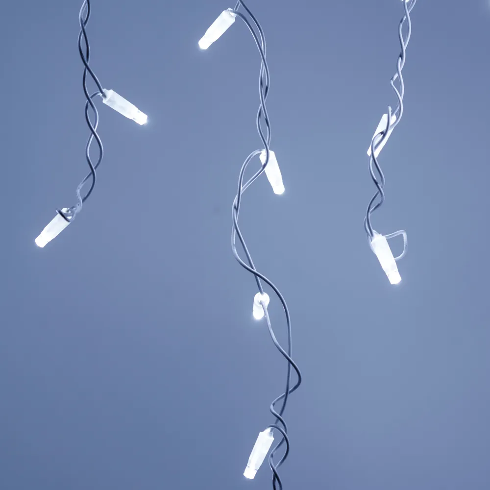 Светодиодная бахрома Classic. Размер 2400x600 мм (длина 2400 мм, по длине 24 нити высотой 200/600 мм). Количество светодиодов 88 шт размером 7 мм. Цвет свечения БЕЛЫЙ (6000 К), эффект постоянного свечения с мягким световым рисунком (выпуклая молочно-белая линза). Провод белый, ПВХ. Питание 230 В, Мощность 6 Вт, защита IP65, применение на улице под навесом. Аксессуары для подключения приобретаются отдельно.