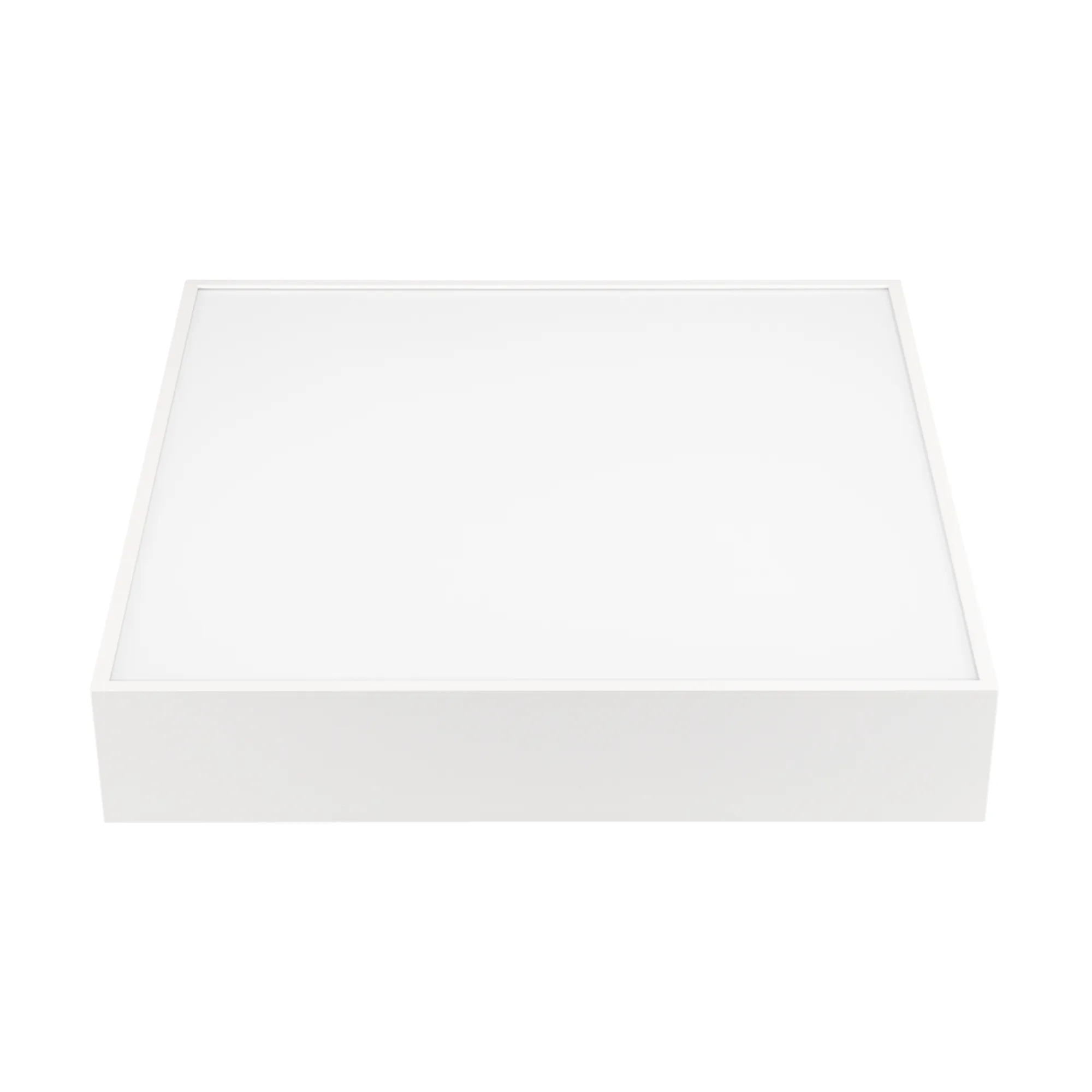 Поставка под заказ от 96 шт. Накладной светильник. Мощность 30 Вт, св. поток 2000-2540 лм, 85 лм/Вт, дневной 4000 K, CRI>90, угол 120°, напряжение питания 230 В. Белый квадратный корпус из алюминия, экран PC, степень защиты IP40. Размер: длина 350 мм, ширина 350 мм, высота 64 мм. Монтаж накладной. Драйвер 27-42 В, 800 мА, пульсация <5%.