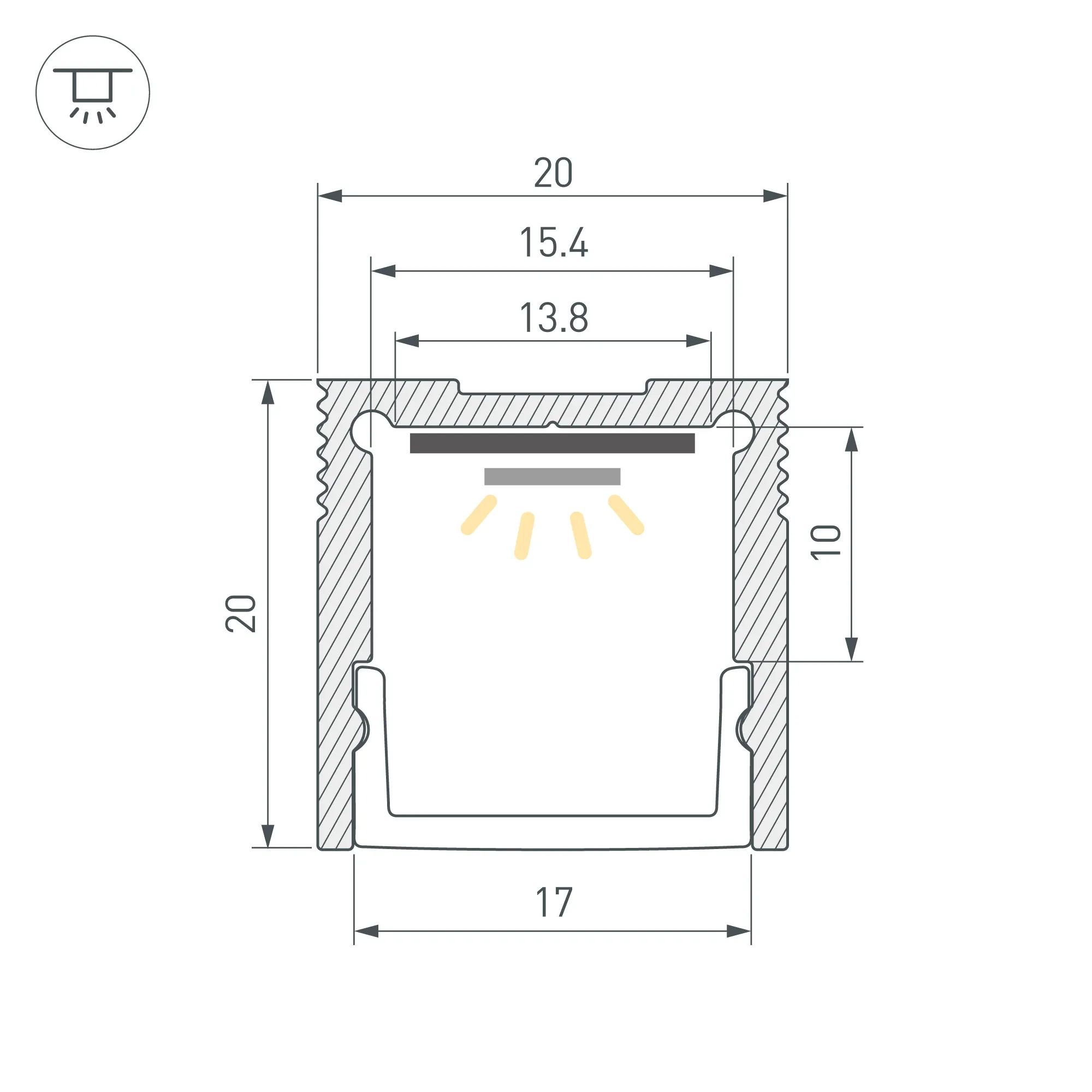 Алюминиевый анодированный профиль для светодиодных лент и линеек. Габаритные размеры (L×W×H): 3000x20x20 мм. Ширина площадки для ленты 15 мм. Экраны, заглушки и другие аксессуары приобретаются отдельно. Цена за 1 метр.