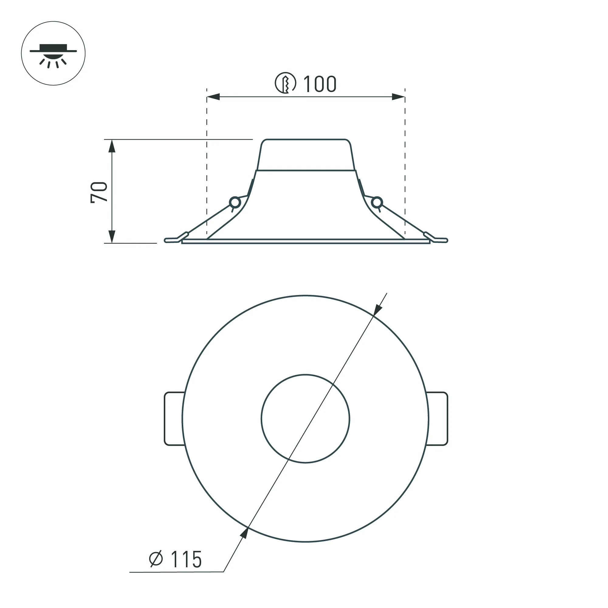 Встраиваемый светильник даунлайт с интегрированным в корпус драйвером. Мощность 10 Вт, св. поток 665лм, 66 лм/Вт, дневной 4000 K, CRI>90, угол 100°, напряжение питания 230 В. Чёрный круглый корпус из алюминия, степень защиты IP20. Размер: диаметр 115 мм, высота 70 мм. Монтаж встраиваемый, установочное отверстие: диаметр 100 мм. Пульсация <2%.
