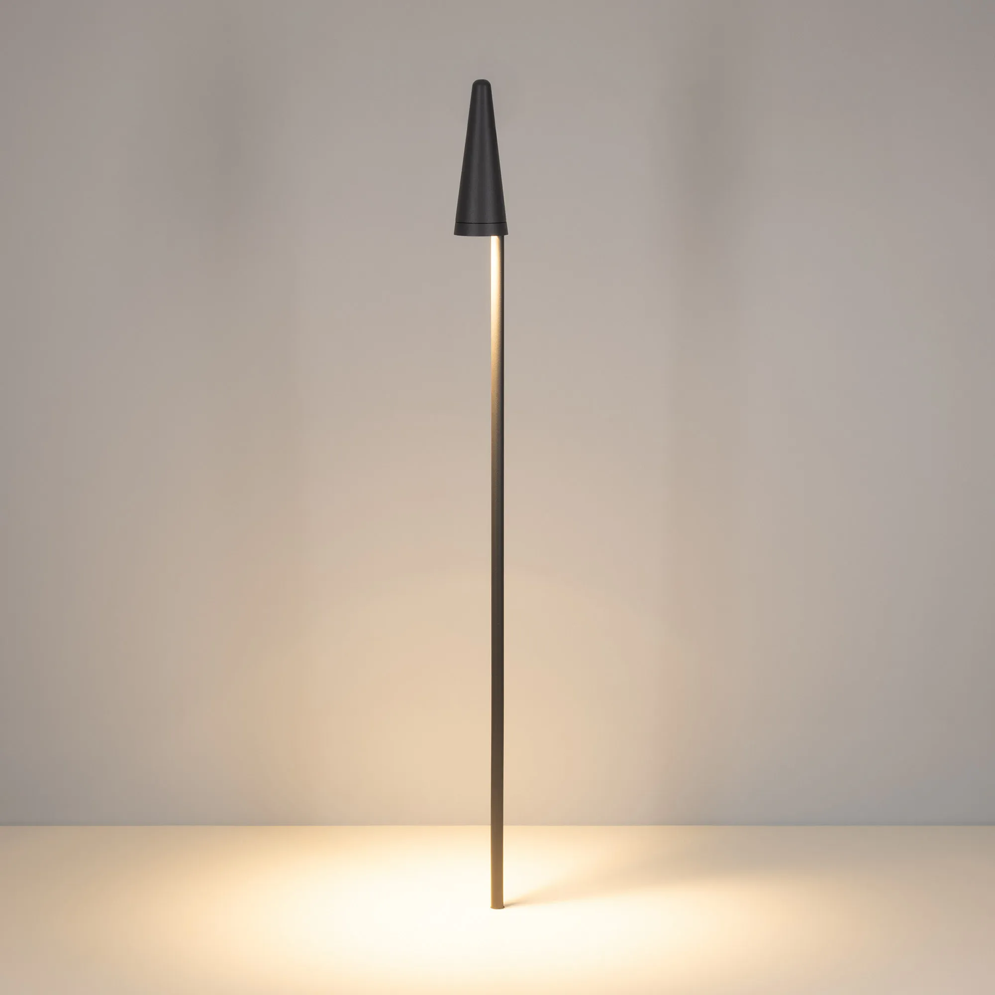 Уличный светодиодный светильник для подсветки дорожек. Мощность 7 Вт, св. поток 680 лм, 97 лм/Вт, теплый 3000 K, CRI>80, угол 36°, напряжение питания 230 В. Темно-серый фигурный корпус из алюминия, экран стекло, степень защиты IP65. Размер: длина 78 мм, ширина 78 мм, высота 1500 мм. Монтаж в грунт. Драйвер 18-24 В, 350 мА, пульсация <2%.