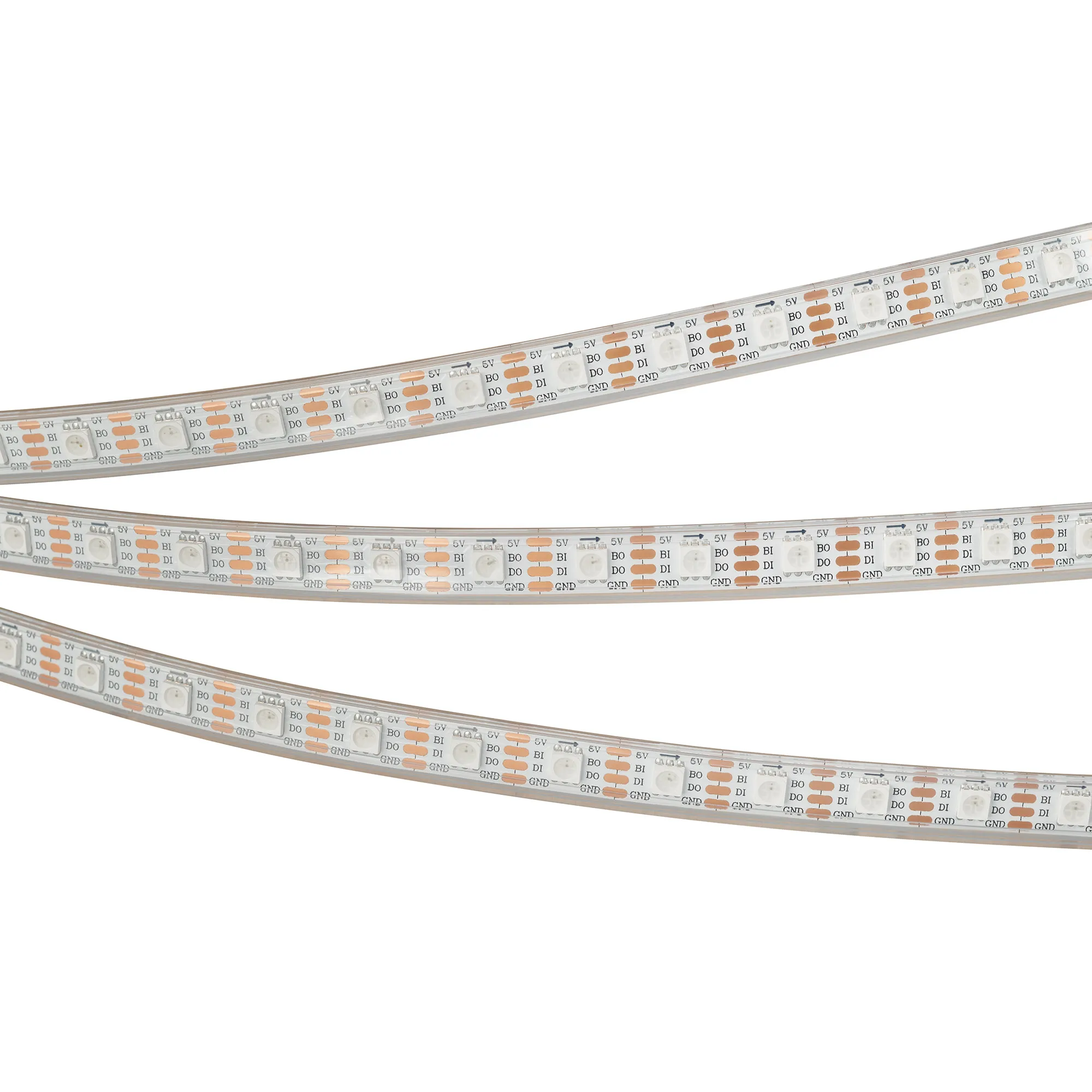 Светодиодная герметичная лента SPI серии B60 с микросхемой SK6812, IP66 (P - силиконовая трубка). Светодиоды SMD 5060, 60 шт/м, 60 pixels на 1 м (300 pixels на 5 м), 1 pixel = 1 светодиод, белая плата шириной 10 мм, скотч 3М. Цвет RGB, угол 120°. Питание 5 В, мощность 12 Вт/м (60 Вт на 5 м). Размеры 5000x12x4 мм. Мин. отрезок 16.7 мм, 1 светодиод. Цена за 1 м.