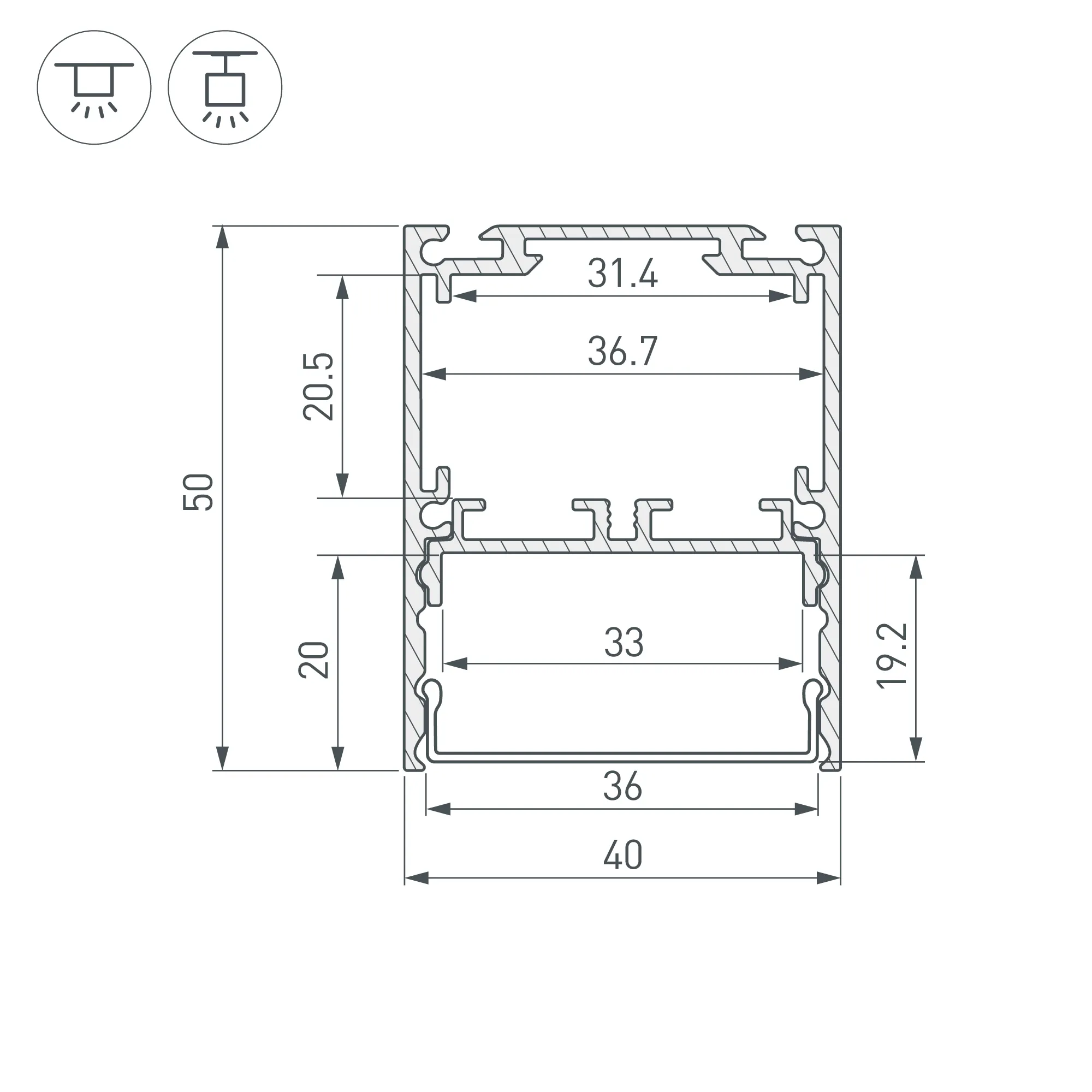 Алюминиевый анодированный профиль со съемной площадкой для светодиодной ленты в комплекте. Цвет - черный. Габаритные размеры (L×W×H): 2000x40x50.6 мм. Ширина площадки для ленты 33мм. Отсек для БП 31.4х20.5 мм. Возможность установки экрана на разных уровнях (три варианта). Экраны, заглушки и другие аксессуары приобретаются отдельно. Цена за 1 метр.