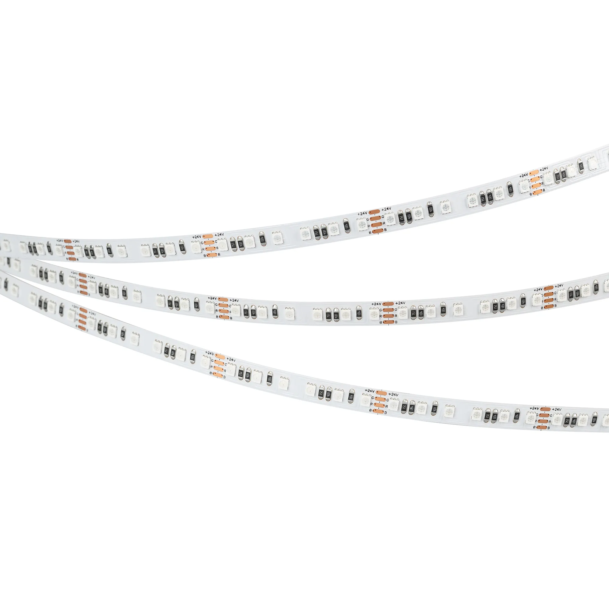 Мультицветная светодиодная лента RT серии A120. Светодиоды SMD 2835, 120 шт/м, белая плата шириной 8 мм, скотч 3M. Цвет RGB, угол 120°. Питание 24 В, мощность 12 Вт/м (60 Вт на 5 м). Размеры 5000x8x1.5 мм. Мин. отрезок 50 мм, 6 светодиодов. Цена за 1 м.