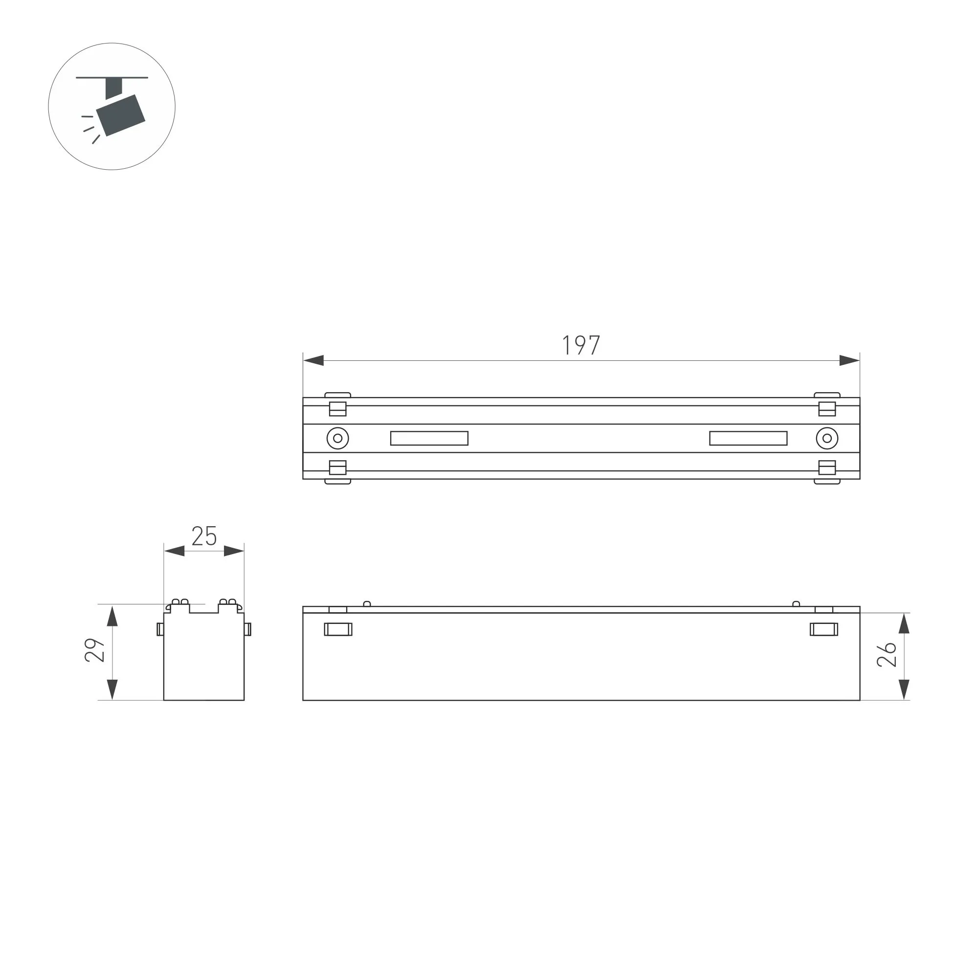 Светильник для магнитных треков MAG-VIBE. Мощность 12 Вт, св. поток 890 лм, 74 лм/Вт, теплый 3000 K, CRI>90, угол 24°, напряжение питания 48 В. Черный прямоугольный корпус из алюминия, экран поликарбонат, степень защиты IP20. Размер: длина 197 мм, ширина 25 мм, высота 29 мм. Монтаж на трек MAG-VIBE. Пульсация <1%.
