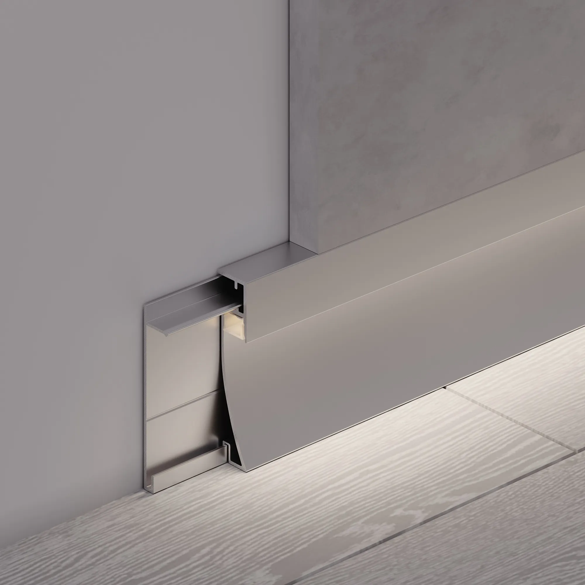 Алюминиевый анодированный накладной двухкомпонентный профиль-плинтус для светодиодных лент и линеек. Габаритные размеры (L×W×H): 2000x14,8x79,7 мм. Ширина площадки для ленты 12,2 мм. Аксессуары приобретаются отдельно. Цена за метр.