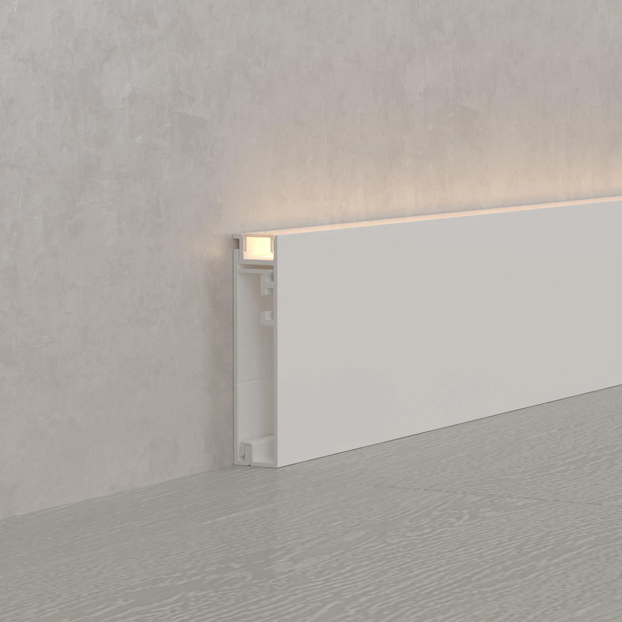 Алюминиевый накладной двухкомпонентный профиль-плинтус для светодиодных лент и линеек. Цвет - белый RAL9003 (порошковая окраска). Габаритные размеры (L×W×H): 2000x12,20x55,50 мм. Ширина площадки для ленты 8 мм. Аксессуары приобретаются отдельно. Цена за метр.