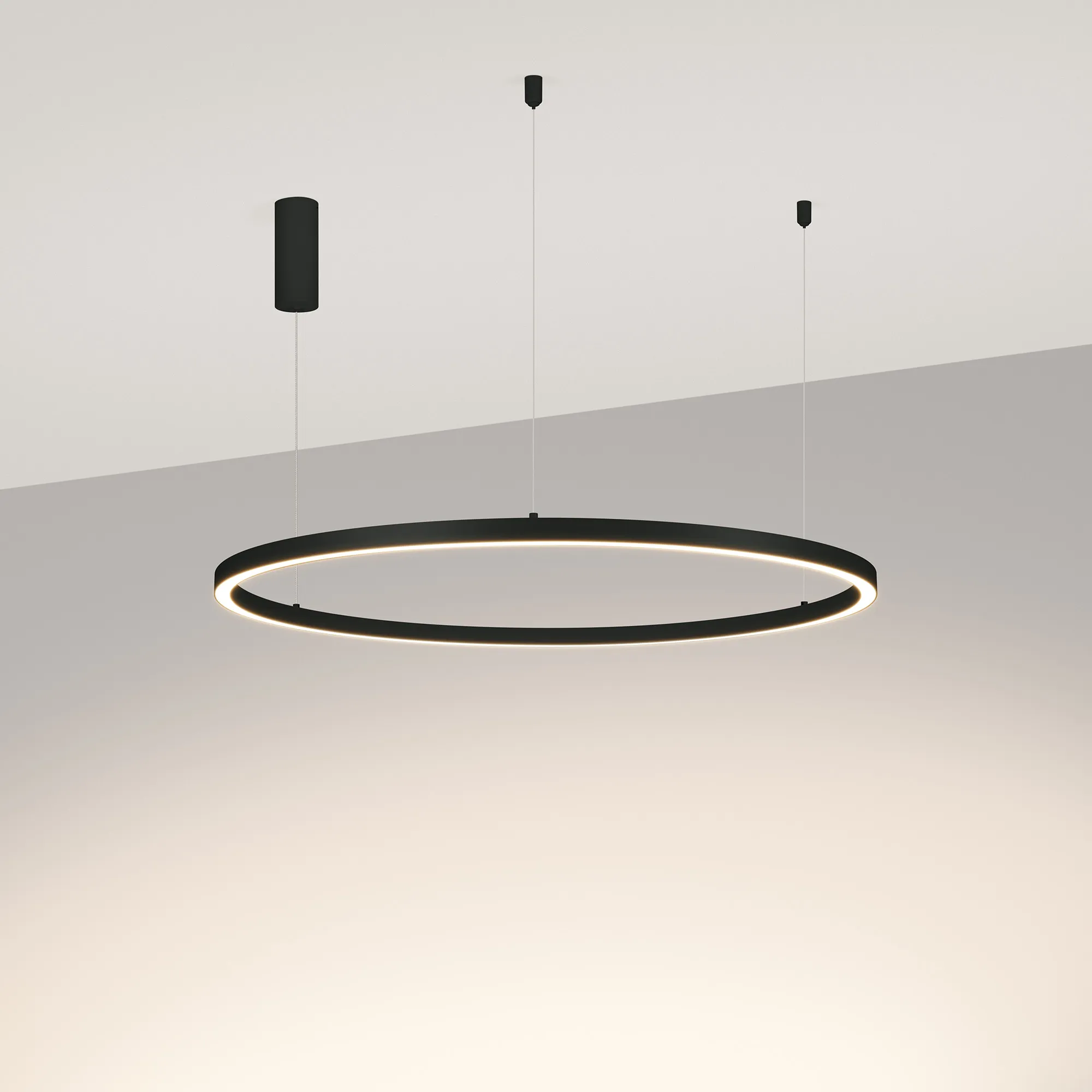 Подвесной светильник. Мощность 42 Вт, св. поток 2500 лм, 60 лм/Вт, дневной 4000 K, CRI>90, угол 120°, напряжение питания 230 В. Черный круглый корпус из алюминия, экран силикон, степень защиты IP20. Размер: диаметр 800 мм, высота 25 мм, ширина профиля 25 мм, размер чаши: диаметр 60 мм, высота 150 мм. Питание AC220-240В, 42Вт. Драйвер:115 x 40 x 28 мм, 33-40В, 1050 мА. Пульсация <5%. Монтаж подвесной, длина подвеса 1200мм.