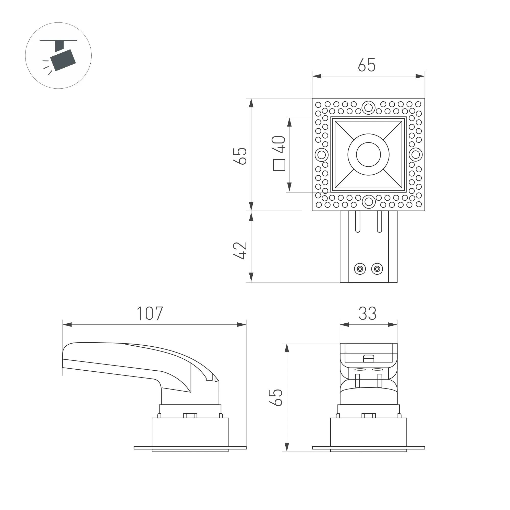 Встраиваемый безрамочный светильник под шпаклевку. Мощность 9 Вт, св. поток 720 лм, 80 лм/Вт, дневной 4000 K, CRI>90, угол 36°, напряжение питания 230 В. Белый квадратный корпус, экран PMMA, степень защиты IP20. Размер: длина 65 мм, ширина 65 мм, высота 63 мм, размер отражателя 40x40 мм. Монтаж встраиваемый, установочное отверстие длина 45 мм, ширина 45 мм. Драйвер 26-40 В, 200 мА, пульсация <2%.