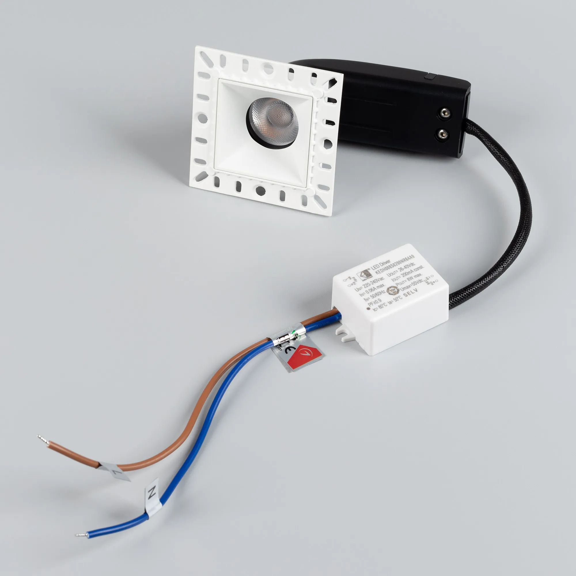 Встраиваемый безрамочный светильник под шпаклевку. Мощность 9 Вт, св. поток 660 лм, 73 лм/Вт, тёплый 3000 K, CRI>90, угол 36°, напряжение питания 230 В. Белый квадратный корпус, экран PMMA, степень защиты IP20. Размер: длина 65 мм, ширина 65 мм, высота 63 мм, размер отражателя 40x40 мм. Монтаж встраиваемый, установочное отверстие длина 45 мм, ширина 45 мм. Драйвер 26-40 В, 200 мА, пульсация <2%.