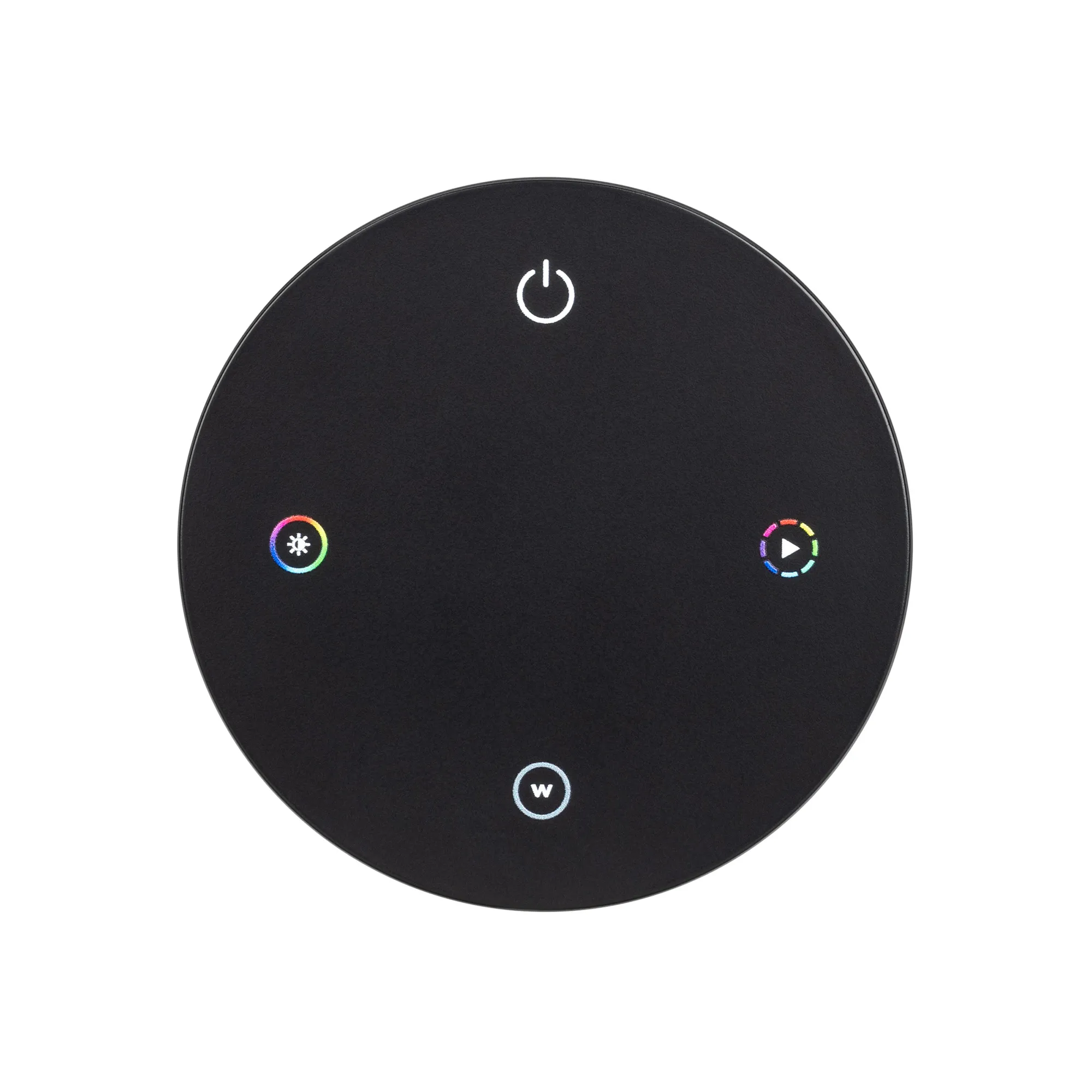 Кнопочный радиопульт 2.4 ГГц чёрного цвета для управления мультицветными (RGB/RGBW) источниками света. 1 зона управления. Питание 3VDC (CR2032). Габариты 75x75x18 мм. Изготовлен из пластика с покрытием, защищающим от загрязнения. Магнитная основа. Управляет контроллерами и панелями серии SMART (поставляются отдельно).