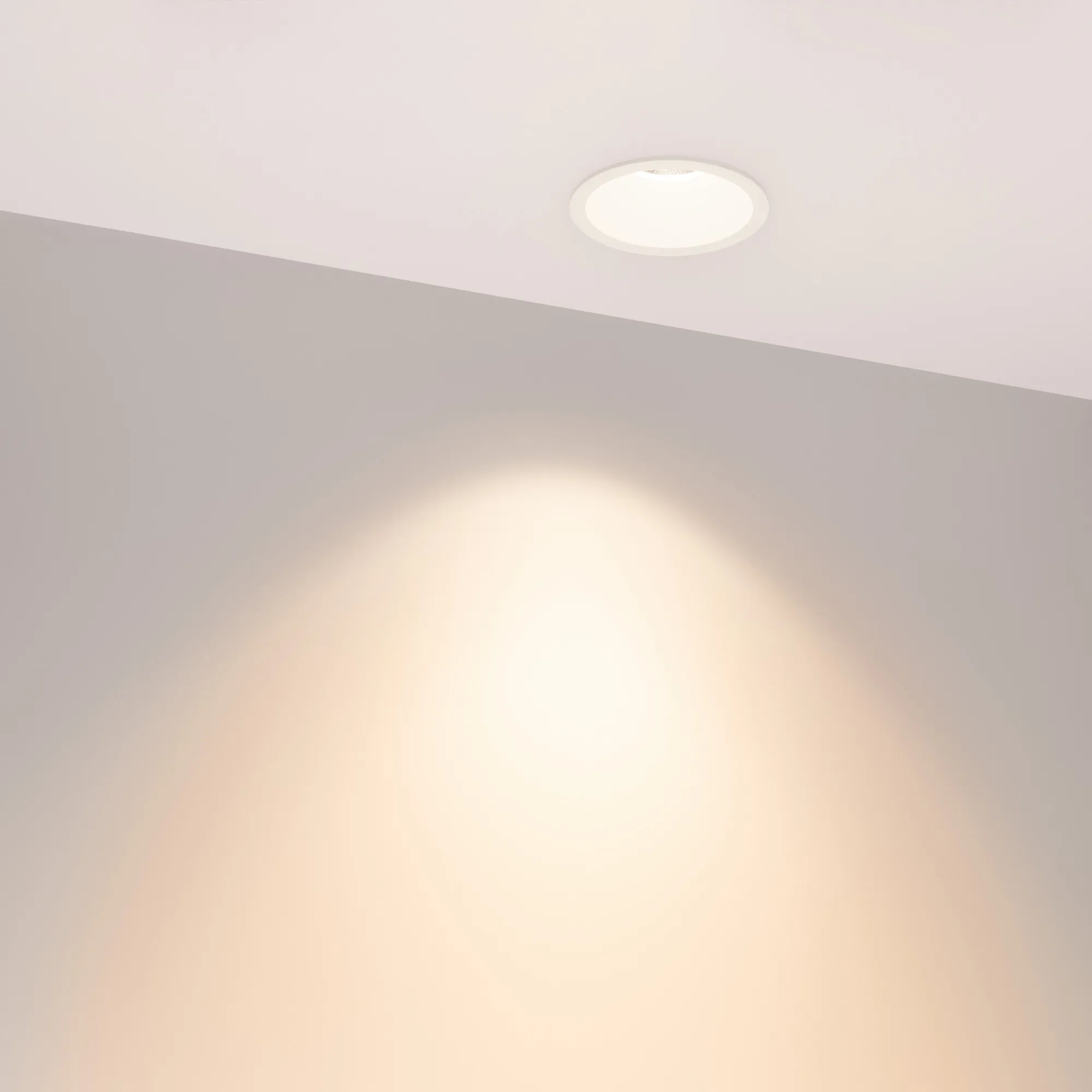 Встраиваемый светильник даунлайт. Мощность 10 Вт, св. поток 980 лм, 98 лм/Вт, тёплый 3000 K, CRI>90, угол 50°, напряжение питания 230 В. Белый круглый корпус из алюминия, степень защиты IP20. Размер: диаметр 82 мм, высота 53 мм. Монтаж встраиваемый, установочное отверстие: диаметр 75 мм. UGR<14. Драйвер 30-42 В, 250 мА, пульсация <2%.