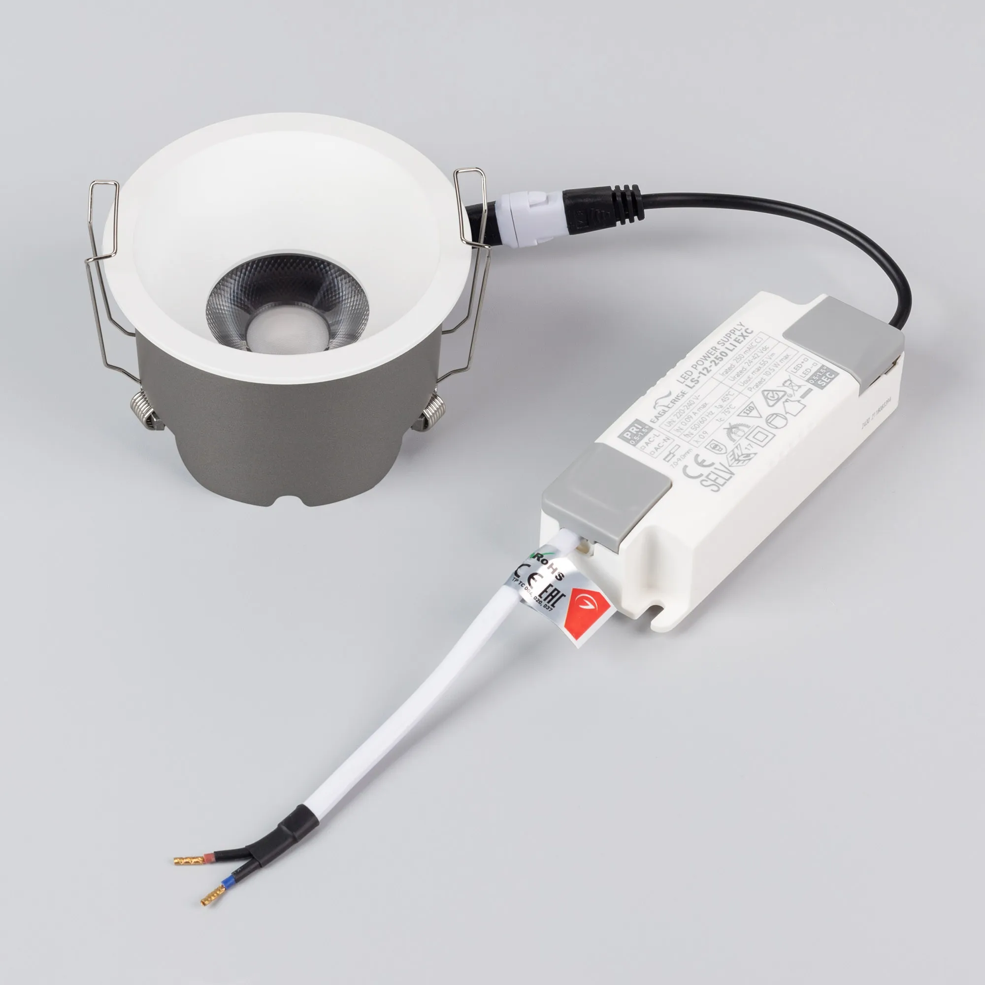 Встраиваемый светильник даунлайт. Мощность 10 Вт, св. поток 980 лм, 98 лм/Вт, тёплый 3000 K, CRI>90, угол 36°, напряжение питания 230 В. Белый круглый корпус из алюминия, степень защиты IP20. Размер: диаметр 82 мм, высота 53 мм. Монтаж встраиваемый, установочное отверстие: диаметр 75 мм. UGR<14. Драйвер 30-42 В, 250 мА, пульсация <2%.