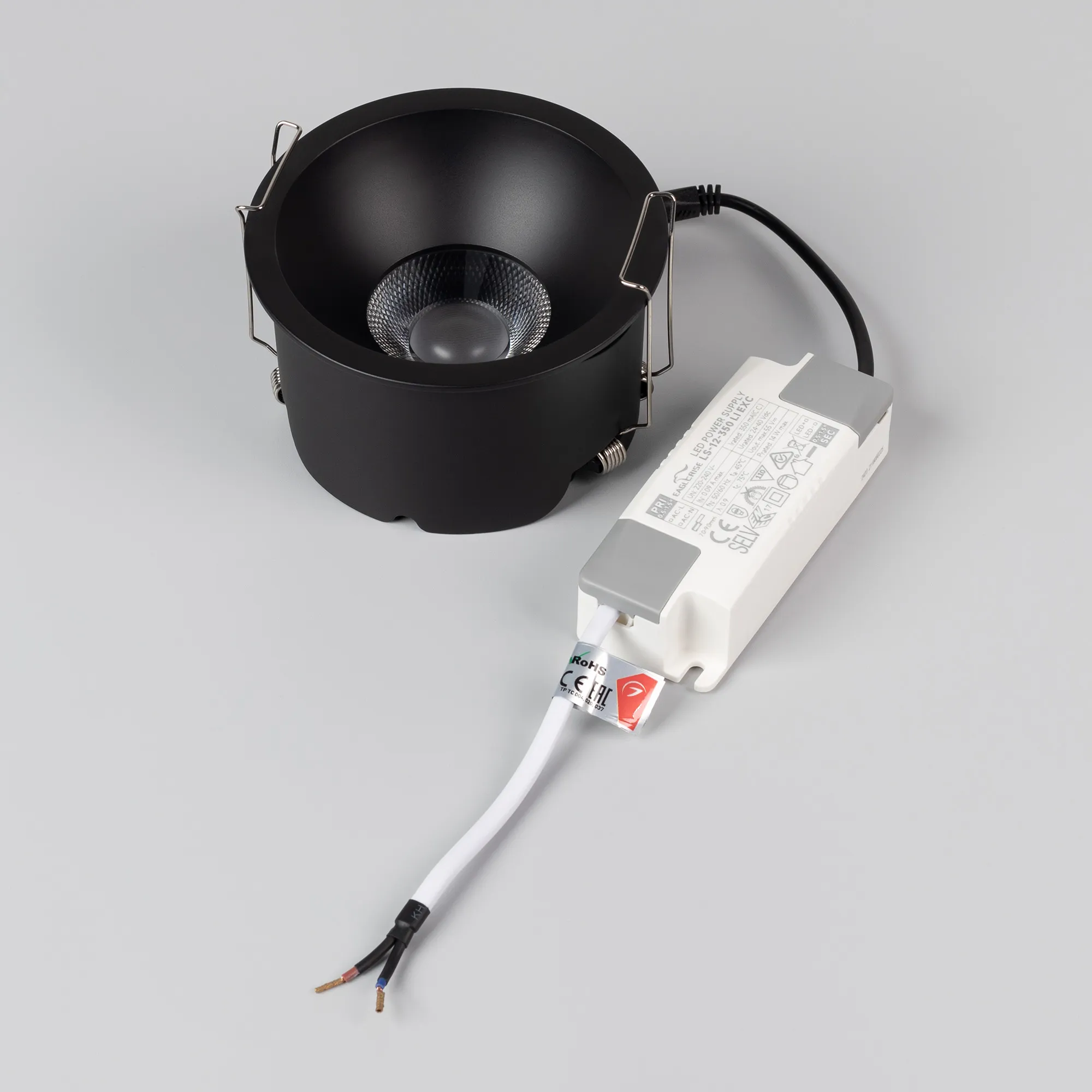 Встраиваемый светильник даунлайт. Мощность 15 Вт, св. поток 1260 лм, 84 лм/Вт, тёплый 3000 K, CRI>90, угол 24°, напряжение питания 230 В. Чёрный круглый корпус из алюминия, степень защиты IP20. Размер: диаметр 106 мм, высота 63 мм. Монтаж встраиваемый, установочное отверстие: диаметр 95 мм. UGR<14. Драйвер 27-40 В, 350 мА, пульсация <2%.
