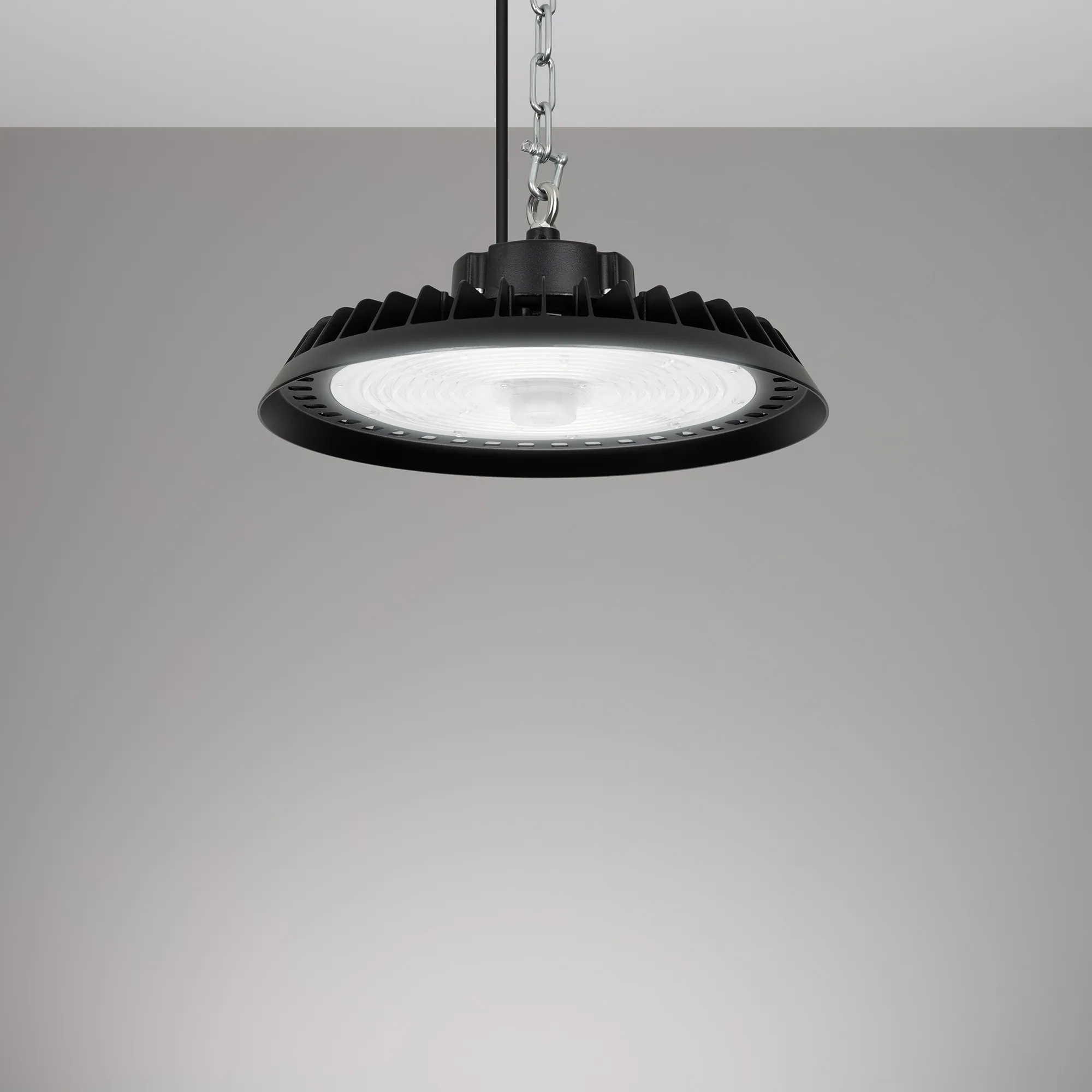 Светильник для освещения складских и промышленных помещений. Мощность 200W, напряжение питания AC 120-270V/50Hz. CRI 80. Тип светодиодов SMD2835, с групповой оптической линзой. Цвет свечения ДНЕВНОЙ 5000K, световой поток 30000 Lm, угол рассеивания 60°. Доступно управление по протоколу 0-10В. Цвет корпуса черный, линза из поликарбоната, степень влагозащиты IP65, ударопрочность IK08. Габариты Ф350xH140мм. Рым-болт в комплекте. Датчик настраивается с помощью пульта 052018 (один на все датчики). Длина кабеля питания 900 мм, кабеля 0-10 200мм.