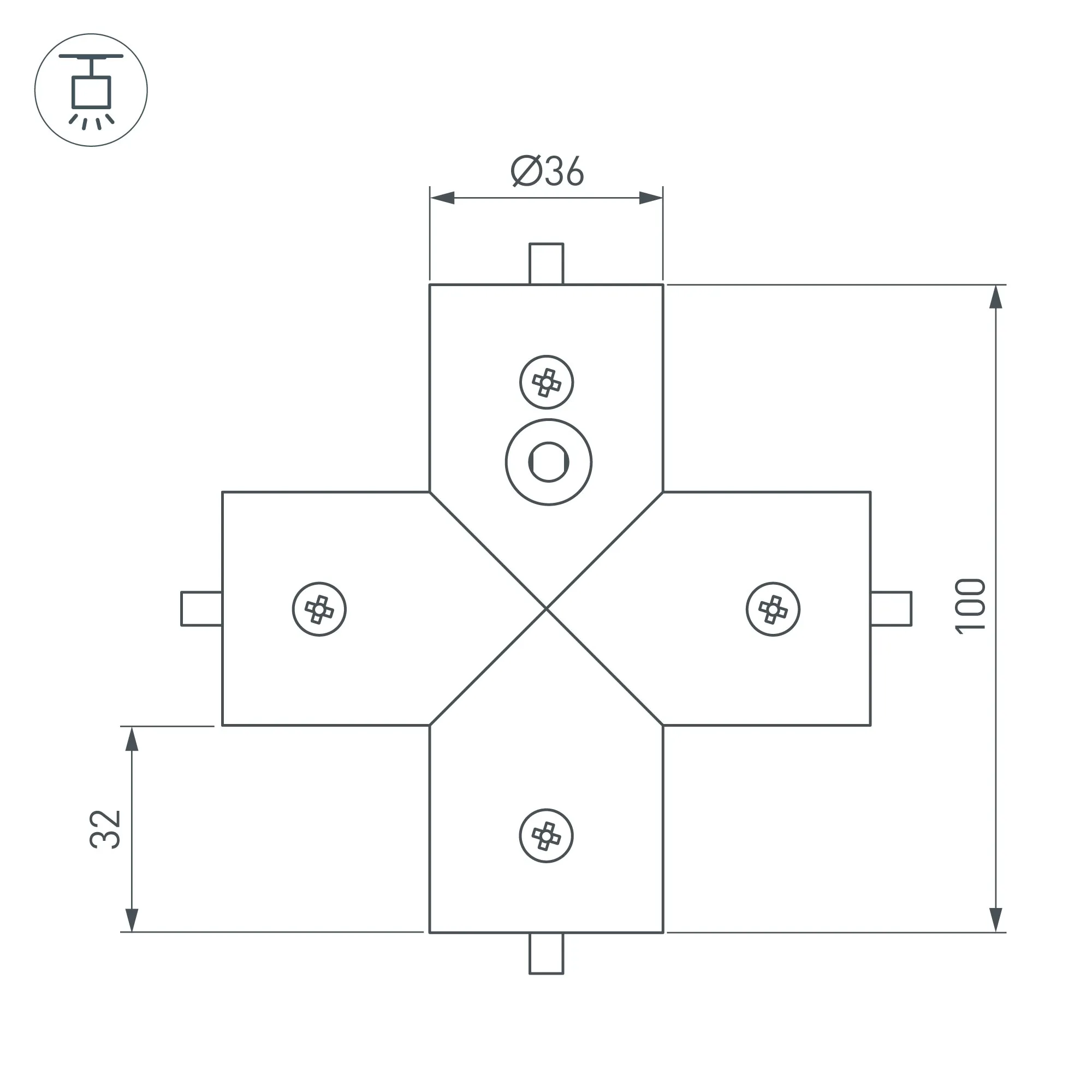 Крестовой коннектор для соединения 4-х отрезков профиля ROUND-D36-360 под углом 90° с отверстием для вывода кабеля питания. В комплекте: соединитель крестообразный - 1 шт., втулка - 4 шт., винт длинный - 4 шт., винт короткий - 12 шт., гермоввод - 1 шт. Цена за комплект.