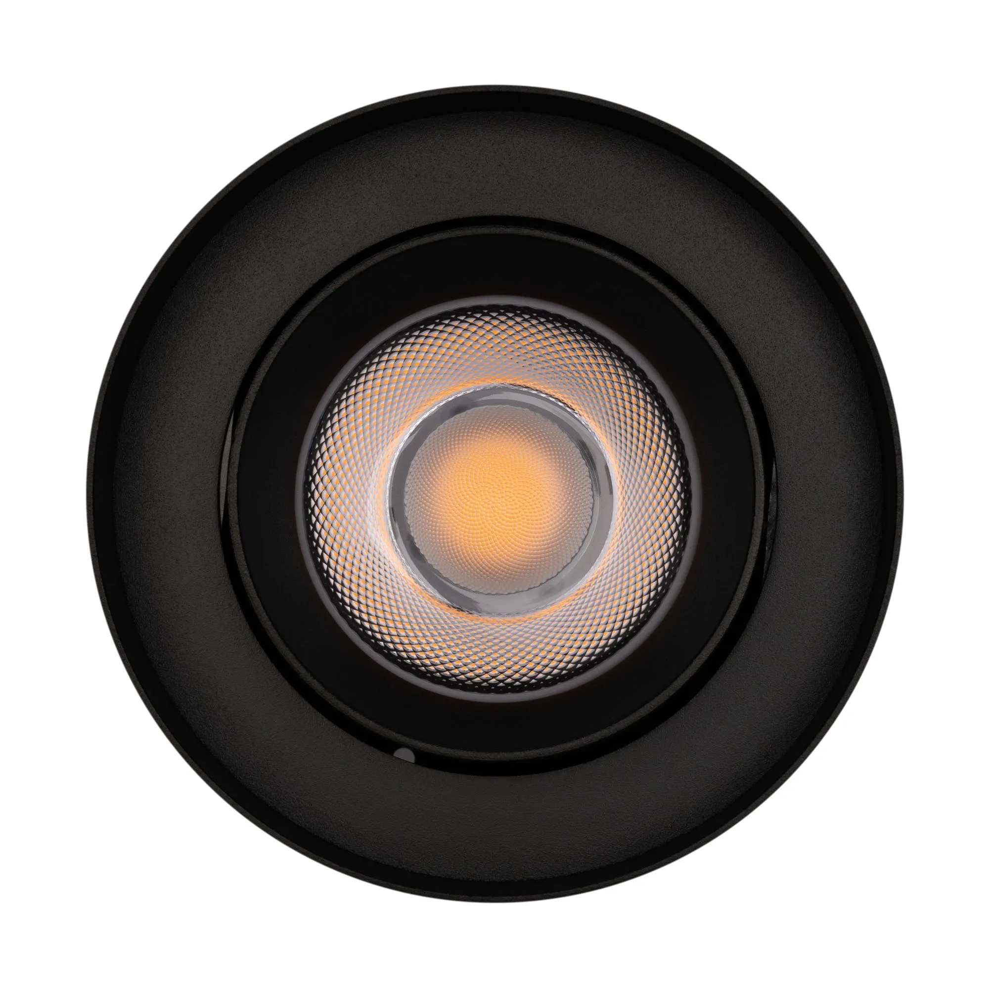 Накладной интерьерный светильник. Мощность 24 Вт, св. поток 2400 лм, 99 лм/Вт, дневной 4000 K, CRI>90, угол 50°, регулируемое направление луча 40°(20+20), поворотный световой модуль вокруг своей оси на 340°, UGR <11, напряжение питания 230 В. Чёрный круглый корпус из алюминия, степень защиты IP54. Размер: диаметр 132 мм, высота 165 мм. Монтаж накладной. Драйвер 27-45 В, 600мА, пульсация <1%.