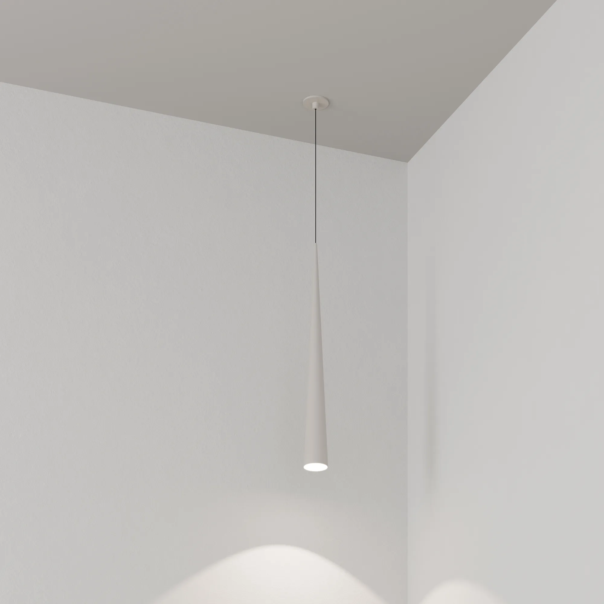 Подвесной светильник. Мощность 5 Вт, св. поток 400 лм, 70 лм/Вт, теплый 2700 K, CRI>92, угол 36°, напряжение питания 230 В. Светло-серый конусообразный вытянутый корпус из алюминия, линза из PMMA, степень защиты IP20. Размер: диаметр 76 мм, высота 670 мм. Монтаж подвесной, длина подвеса 2000 мм, регулируемая. В комплекте 2 вида чаш. Габариты встраиваемой чаши: Ø 80x41 мм. Габариты накладной чаши Ø80x60 мм. Драйвер 2,8-12В, 500 мА, пульсация <1%.