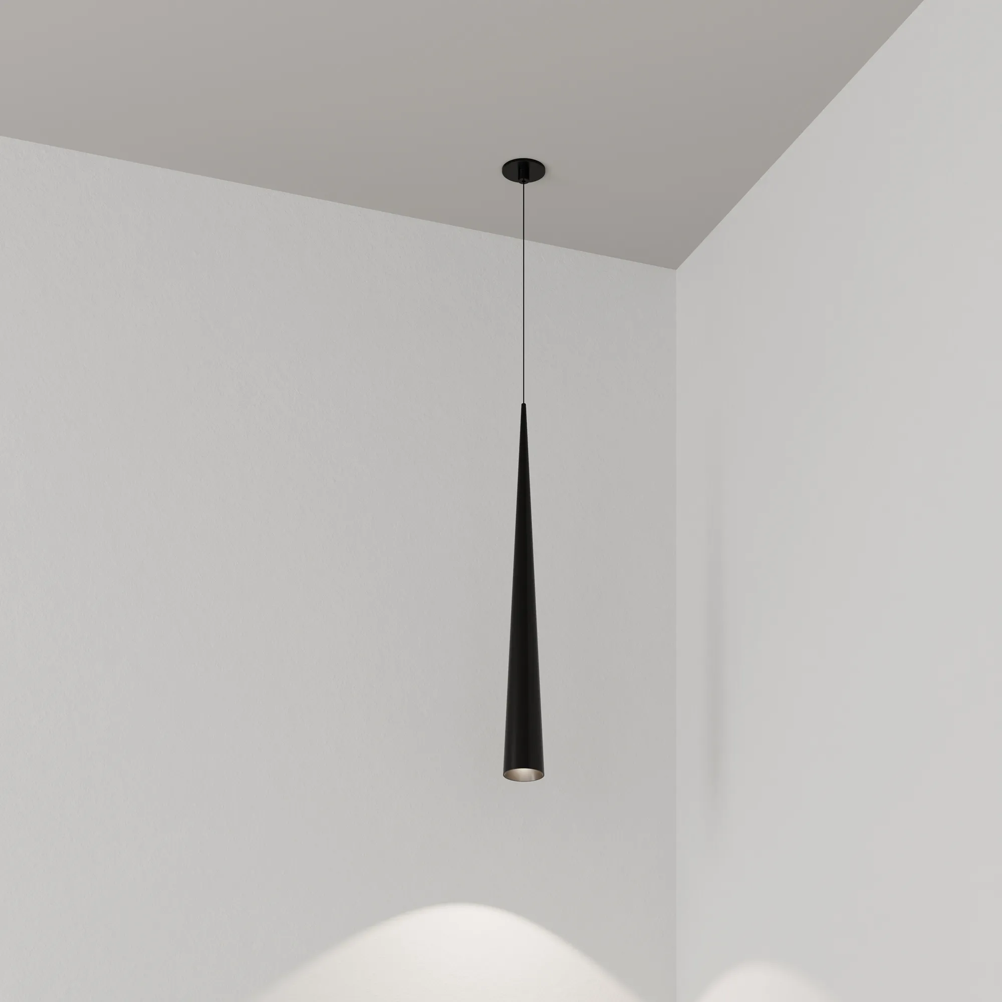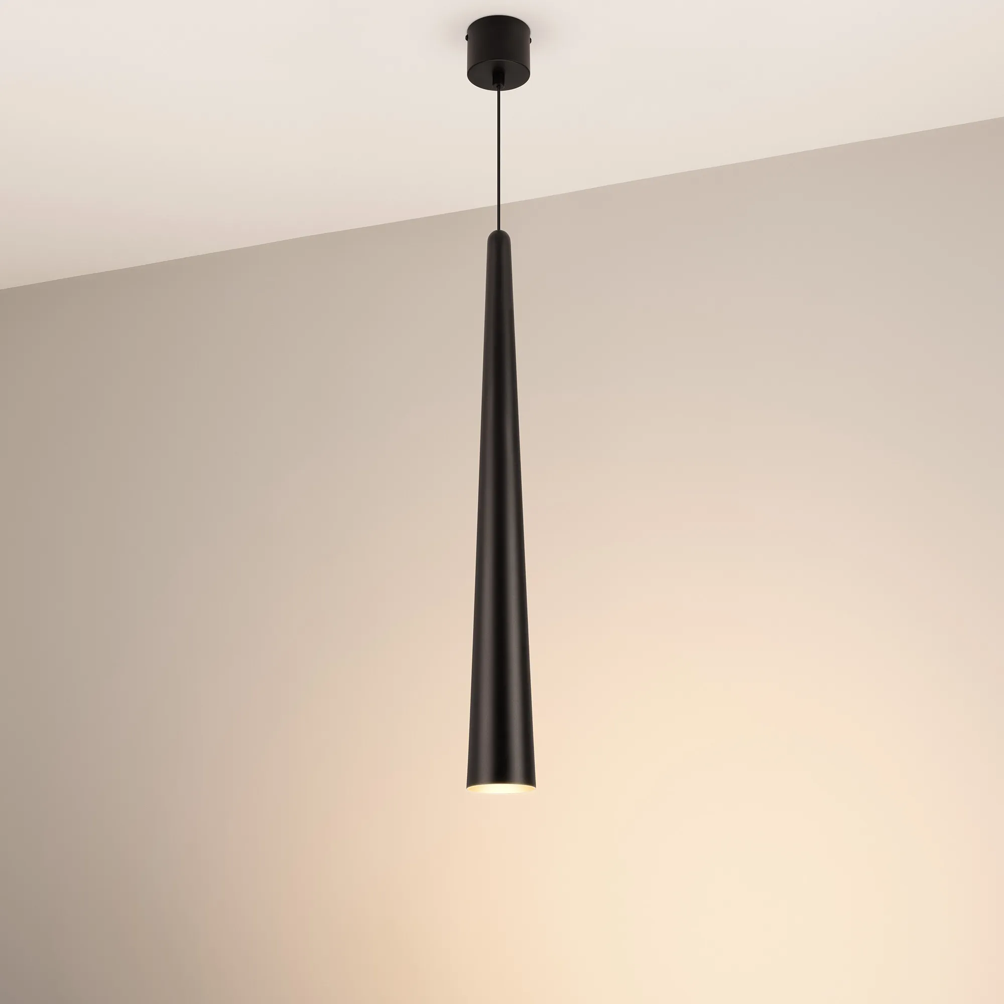 Подвесной светильник. Мощность 5 Вт, св. поток 400 лм, 70 лм/Вт, теплый 3000K, CRI>92, угол 36°, напряжение питания 230 В. Чёрный конусообразный вытянутый корпус из алюминия, линза из PMMA, степень защиты IP20. Размер: диаметр 76 мм, высота 670 мм. Монтаж подвесной, длина подвеса 2000 мм, регулируемая. В комплекте 2 вида чаш. Габариты встраиваемой чаши: Ø 80x41 мм. Габариты накладной чаши Ø80x60 мм. Драйвер 2,8-12В, 500 мА, пульсация <1%.