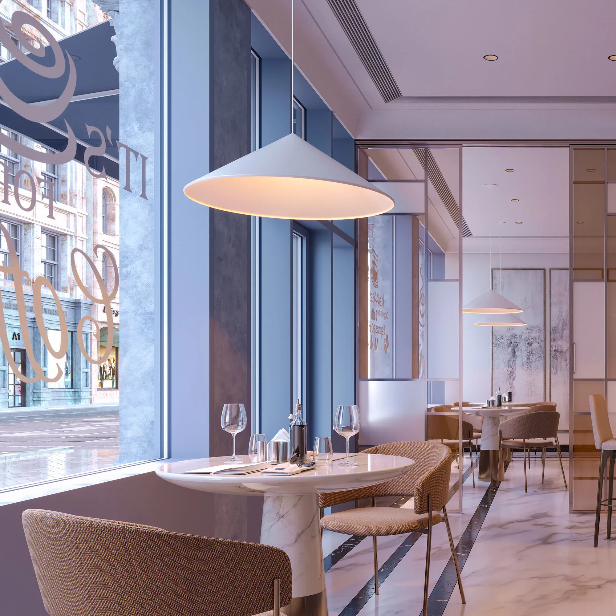 Подвесной светильник. Мощность 14 Вт, св. поток 1200 лм, 74 лм/Вт, тёплый 2700K, CRI>97, угол 36°, напряжение питания 230 В. Белый корпус из алюминия в форме конуса с белой внутренней поверхностью, линза-рассеиватель из PMMA, степень защиты IP20. Размер: диаметр 550 мм, высота 340 мм. Монтаж подвесной, длина подвеса 2000 мм, регулируемая. В комплекте 2 вида чаш. Габариты встраиваемой чаши: Ø 80x23 мм. Габариты накладной чаши Ø140x55 мм. Драйвер 27-42 В, 350 мА, пульсация <1%. Управление по TRIAC.