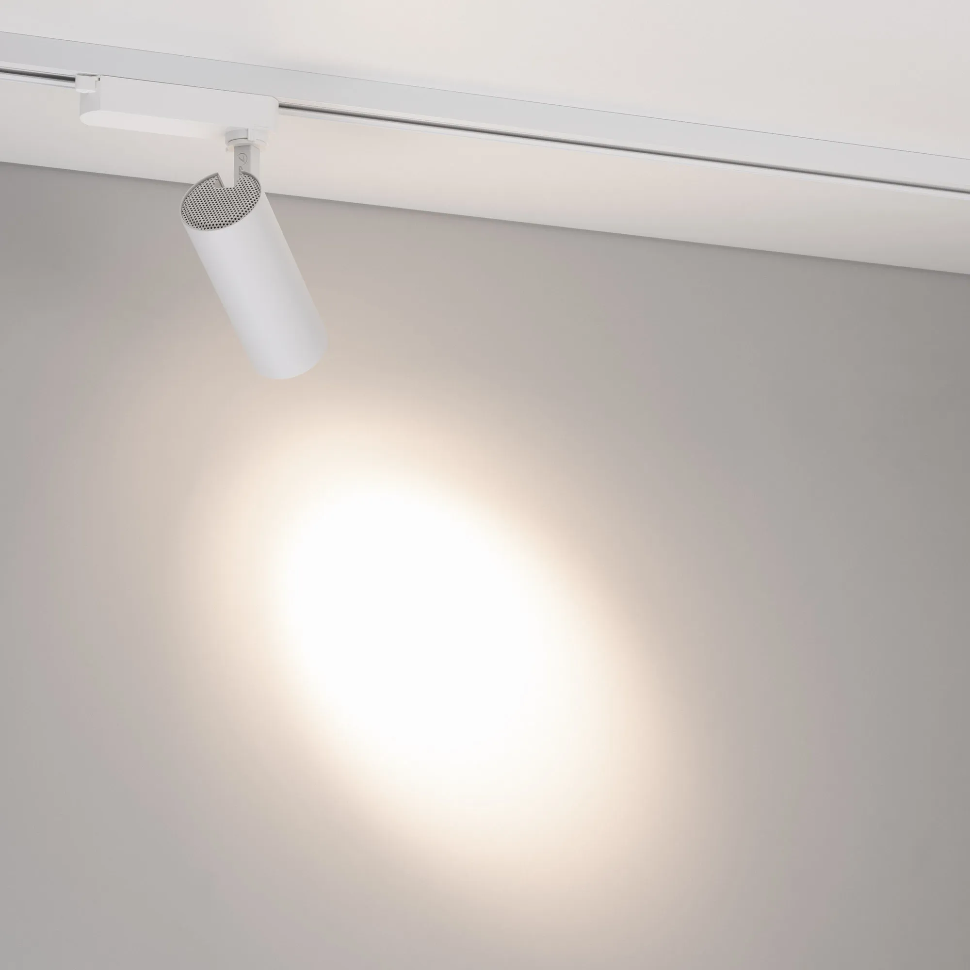 Светильник для треков/шин 2 провода. Мощность 10 Вт, св. поток без решетки honeycomb 1000 лм, 100 лм/Вт, с решеткой honeycomb 660 лм, 66 лм/Вт, дневной 4000 K, CRI>90, угол 24°, напряжение питания 230 В. Белый круглый корпус из алюминия, материал линзы PMMA, степень защиты IP20. Размер: диаметр 55 мм, длина световой части 141 мм. Монтаж на трек 1-фазный. Драйвер встроенный 25-40 В, 250мА., пульсация <5%.