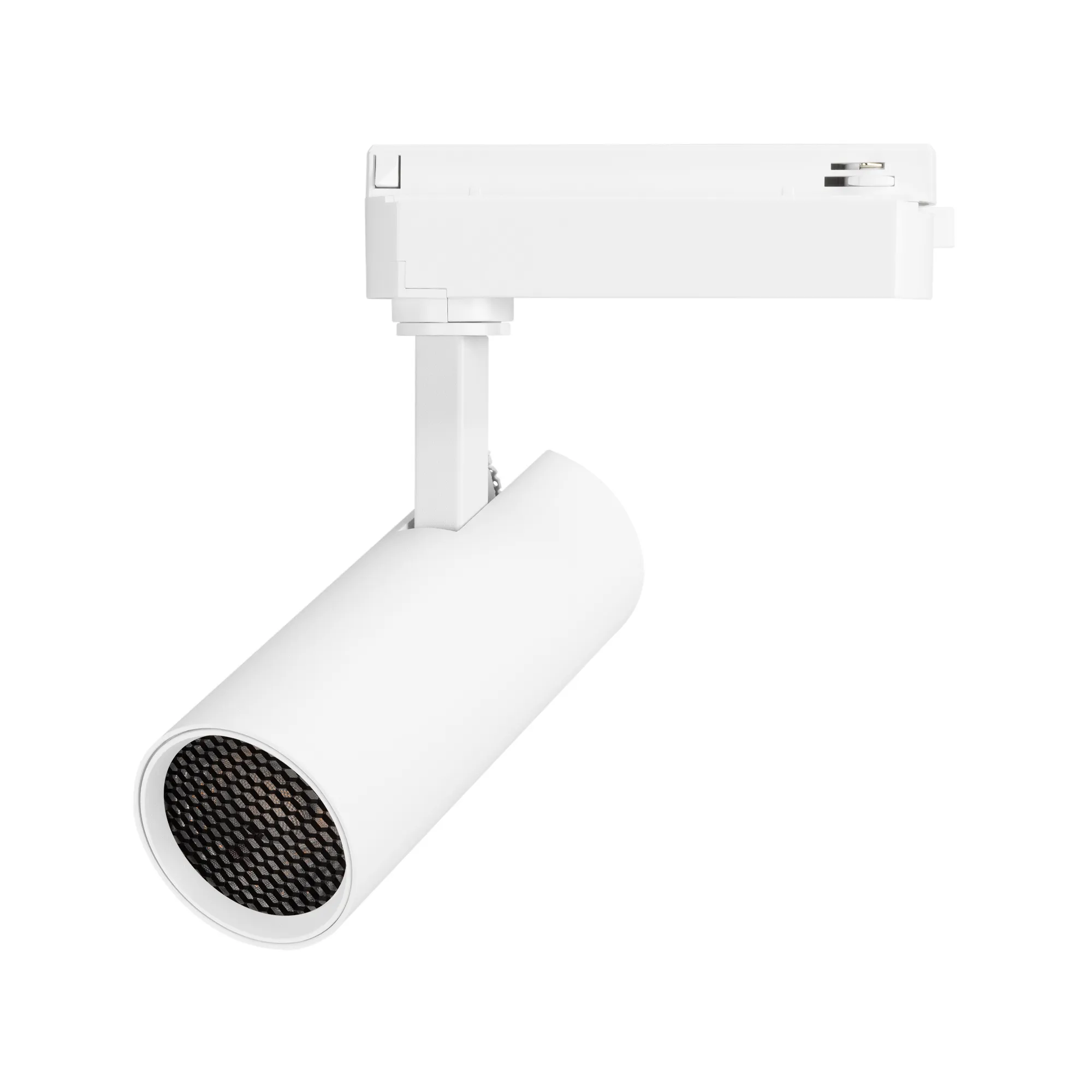 Светильник для треков/шин 2 провода. Мощность 15 Вт, св. поток без решетки honeycomb 1500 лм, 100 лм/Вт, с решеткой honeycomb 990 лм, 66 лм/Вт, тёплый 3000 K, CRI>90, угол 55°, напряжение питания 230 В. Белый круглый корпус из алюминия, материал линзы PMMA, степень защиты IP20. Размер: диаметр 60 мм, длина световой части 141 мм. Монтаж на трек 1-фазный. Драйвер встроенный 350 мА 25-40 В, пульсация <5%.