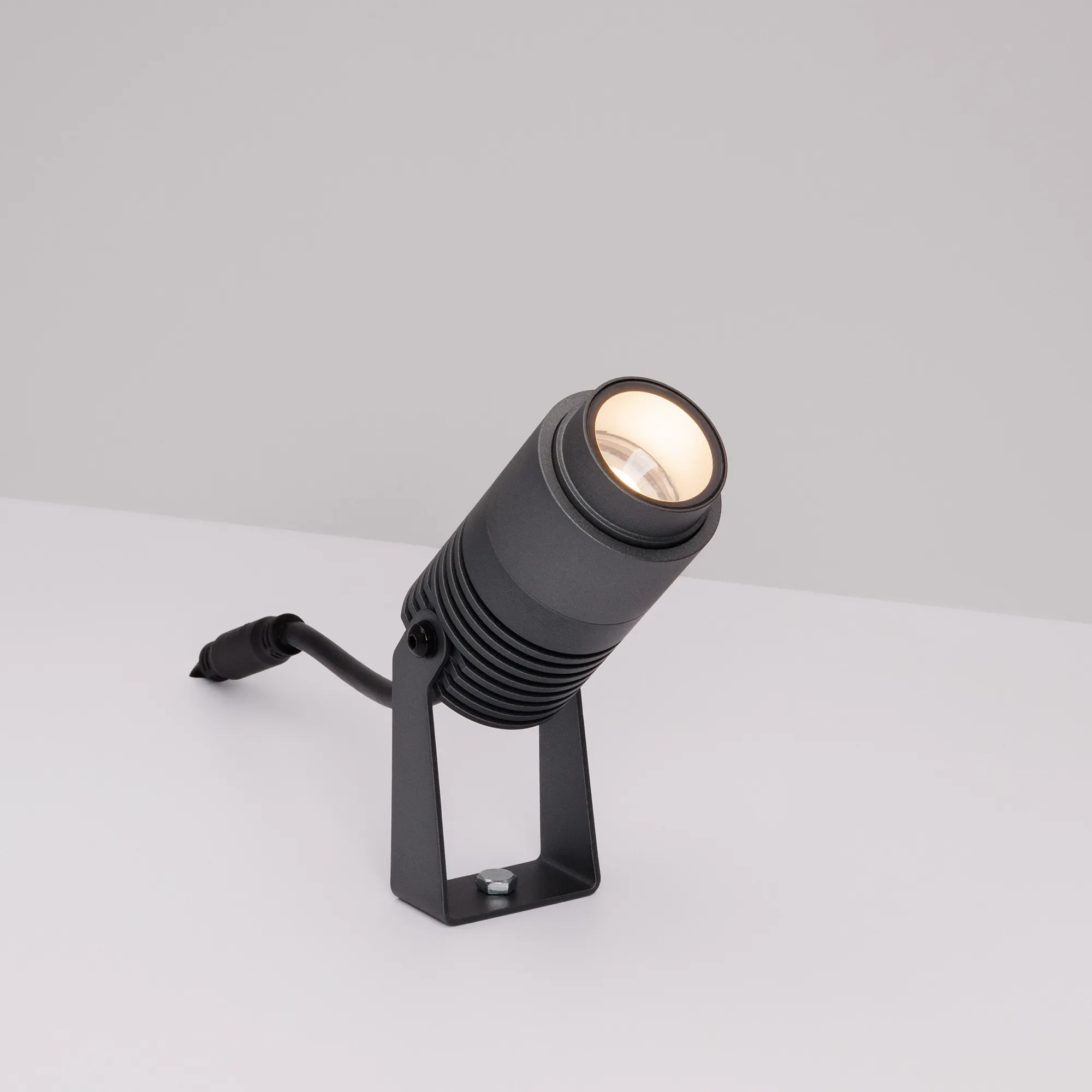 Уличный светодиодный прожектор, мощность 8Вт, регулируемый угол освещения 10-40°. Цвет ТЕПЛЫЙ 3000К, световой поток для угла 10° 240 для угла 40° 420лм. Влагозащищенный корпус IP67 - темно-серый алюминий, экран из закаленного стекла. Угол поворота корпуса в вертикальной плоскости 135°. Питание 230В, мощность 8 Вт. Размеры DxH - Ø52x103мм. В комплекте 1м провод.
