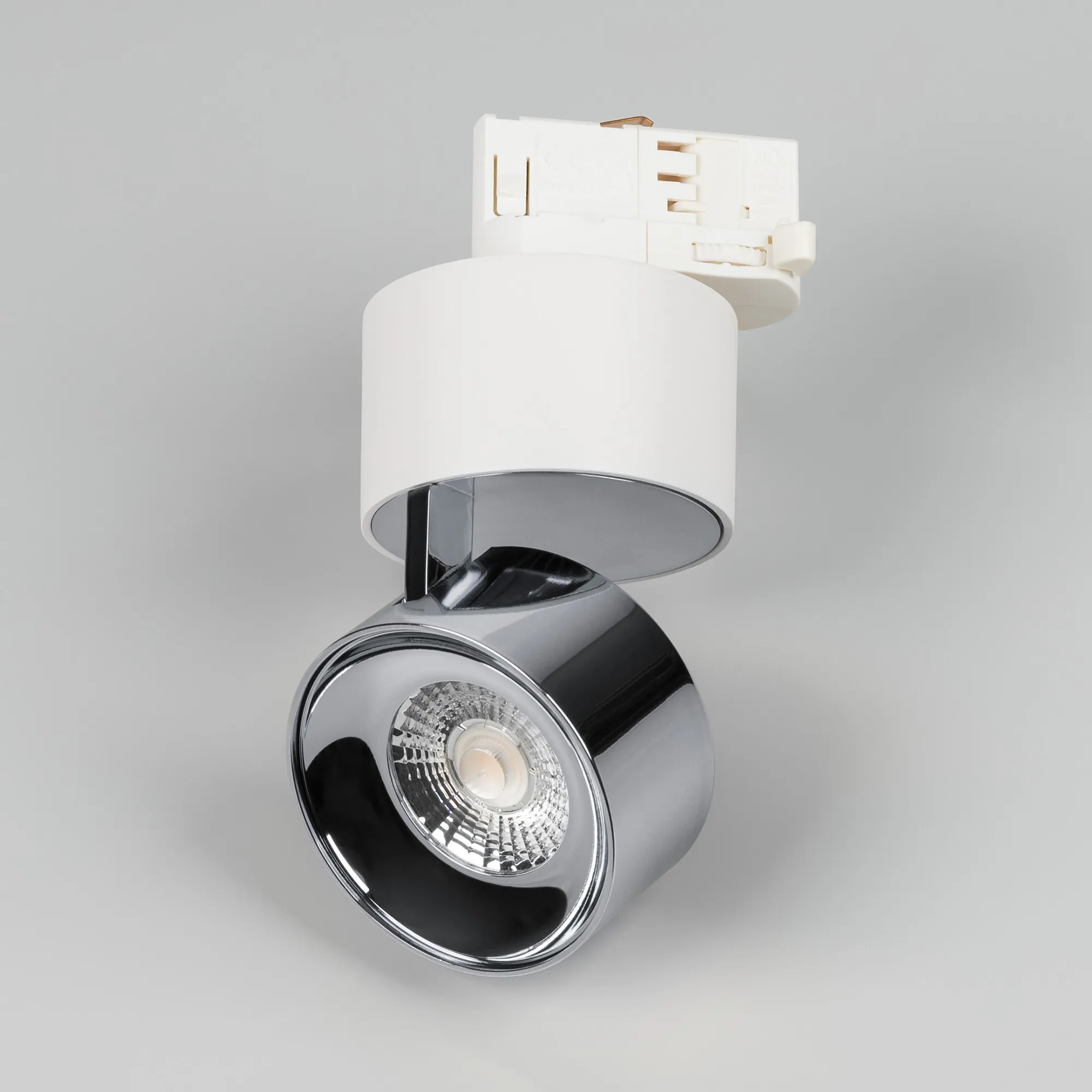 Светильник для треков/шин 4 провода. Мощность 9 Вт, св. поток 500 лм, 55 лм/Вт, теплый 3000 K, CRI>90, угол 36°, напряжение питания 230 В. Модуль цвет хром, белый круглый корпус из алюминия, степень защиты IP20. Размеры корпуса: длина адаптера 86 мм, ширина 32 мм, высота 38,2 мм., высота основания 46 мм. Размер светодиодного модуля: диаметр 77 мм, высота 59 мм. Монтаж на трек 3-фазный. Драйвер 38 В, 200 мА, пульсация <1%.