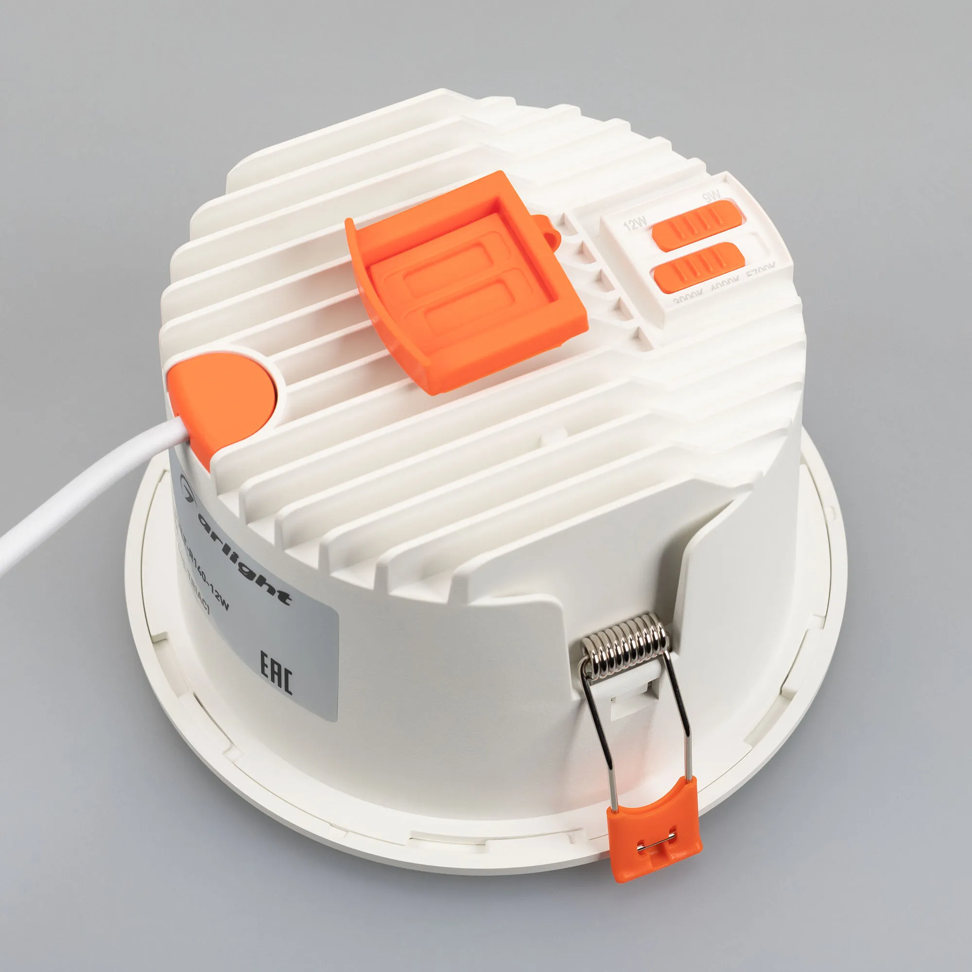 Встраиваемый светильник даунлайт с изменяемой мощностью и цветовой температурой. Мощность 9-12 Вт, св. поток 950-1310лм, 100 лм/Вт, цветовая температура 3000-4000-5700 K, CRI>90, угол 60°, напряжение питания 230 В. Белый круглый корпус, степень защиты IP54. Размер: диаметр 140 мм, высота 80 мм. Монтаж встраиваемый, установочное отверстие: диаметр 122-127 мм. TRIAC-драйвер, пульсация <1%.