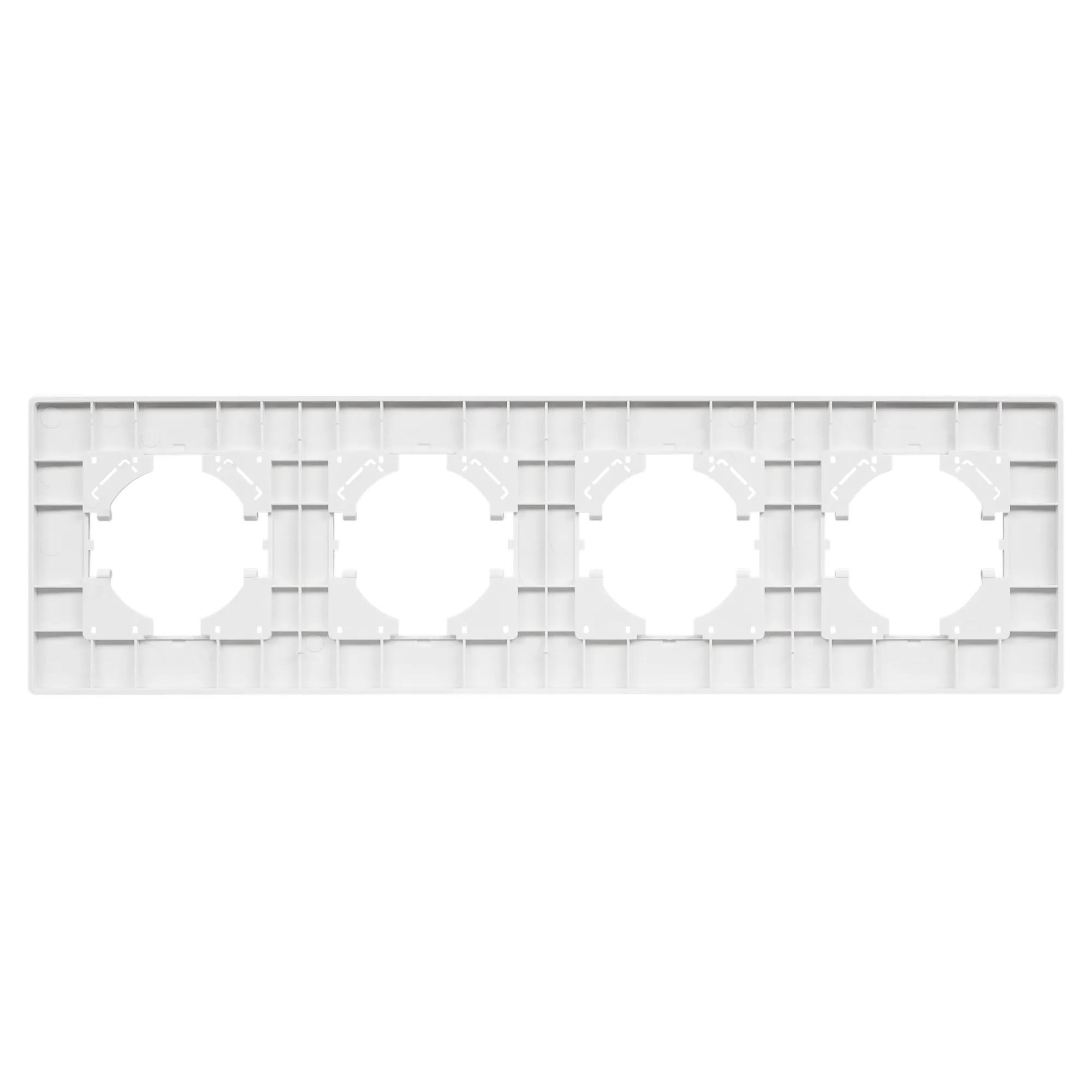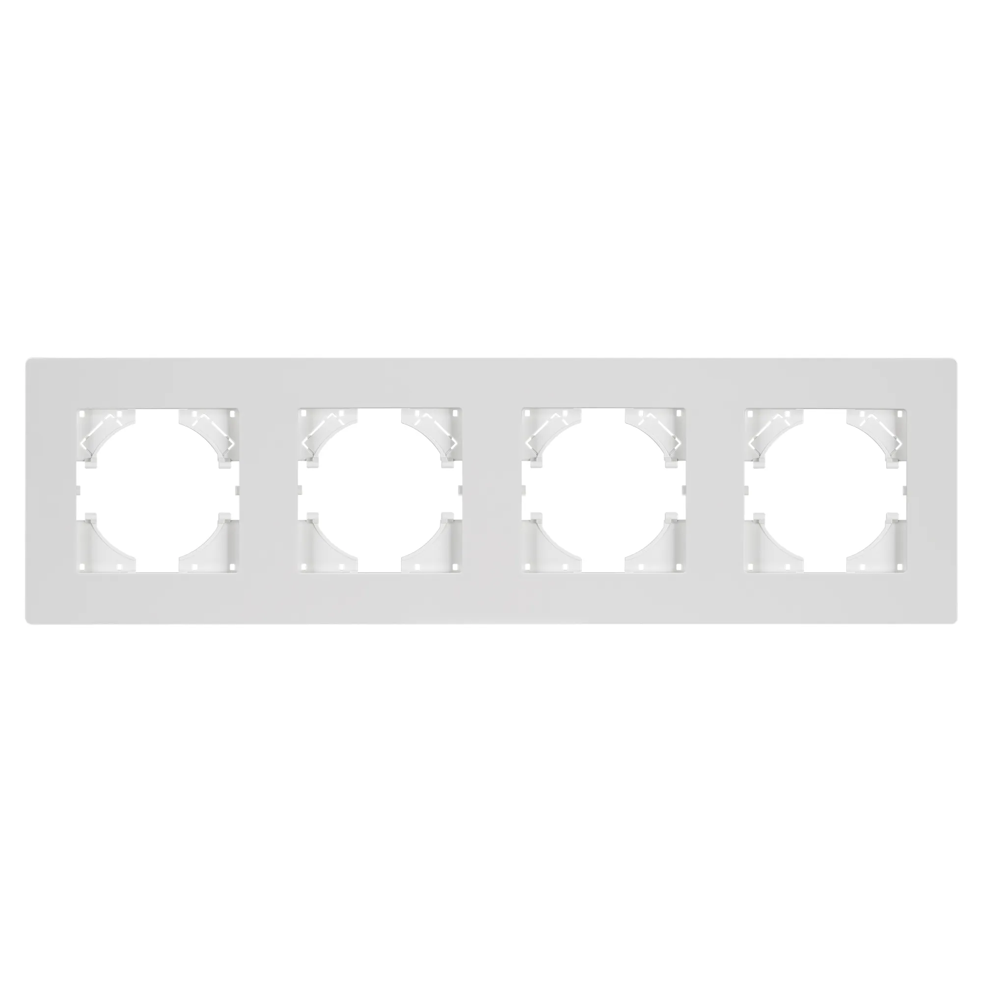 Рамка пластиковая на 4 поста, под встраиваемый механизм. Цвет - белый. Уровень герметичности IP20. Ориентация монтажа - горизонтальная (основным ориентиром служат посадочные выступы для накладки механизма).