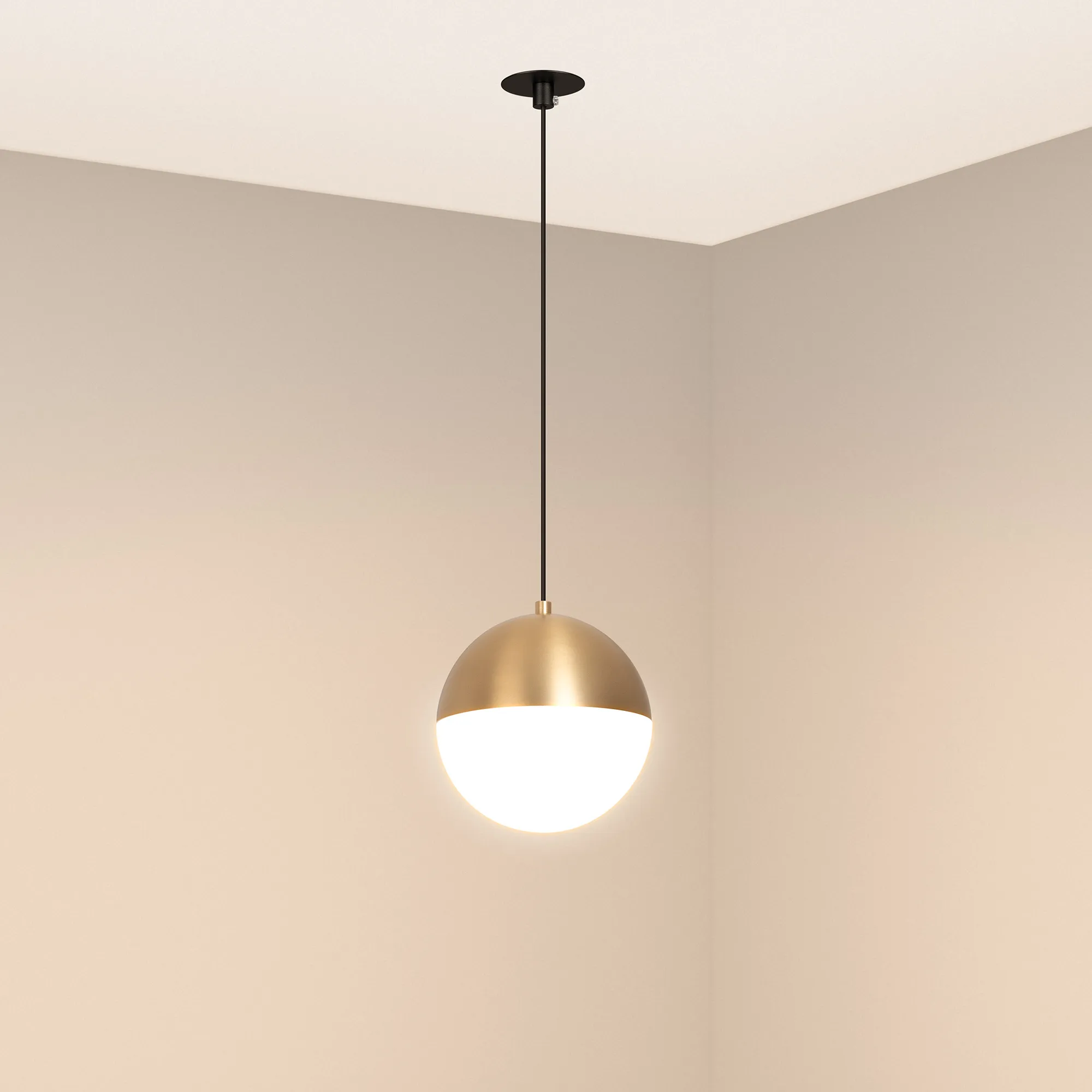 Светильник подвесной. Мощность 11 Вт, св. поток 960 лм, 80 лм/Вт, теплый 3000 K, CRI>90, угол 170°, напряжение питания 230 В. Золотой корпус из алюминия, материал плафона стекло, степень защиты IP20. Размер: диаметр 150 мм, длина подвеса 1500 мм. Потолочная чаша встраиваемая, черного цвета. Размеры Ø 60x40 мм. Размер врезного отверстия Ø 50 мм. Драйвер 28-42 В, 250 мА, пульсация <1%.