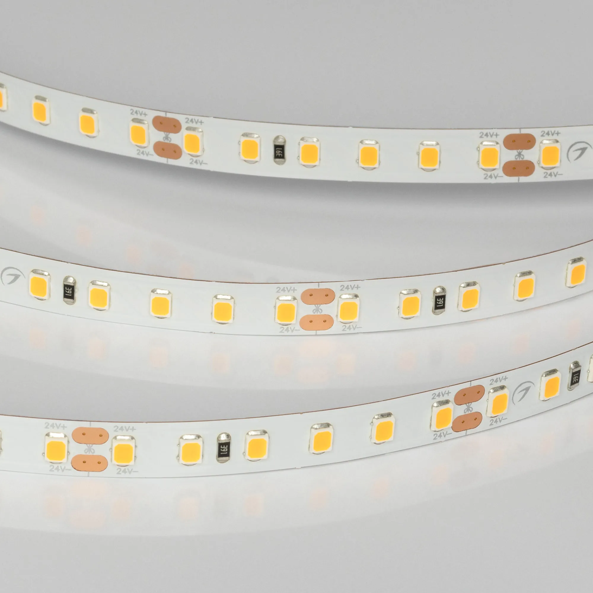 Светодиодная лента UL серии A120. Светодиоды SMD 2835, 120 шт/м, белая плата шириной 8 мм, скотч 3M. Цвет ТЕПЛЫЙ 2400K, индекс цветопередачи CRI>90, угол 120°. Питание 24 В, мощность 9.6 Вт/м (48 Вт на 5 м). Размеры 5000x8x1.5 мм. Мин. отрезок 50 мм, 6 светодиодов. Цена за 1 м. Рекомендуется установка на профиль.