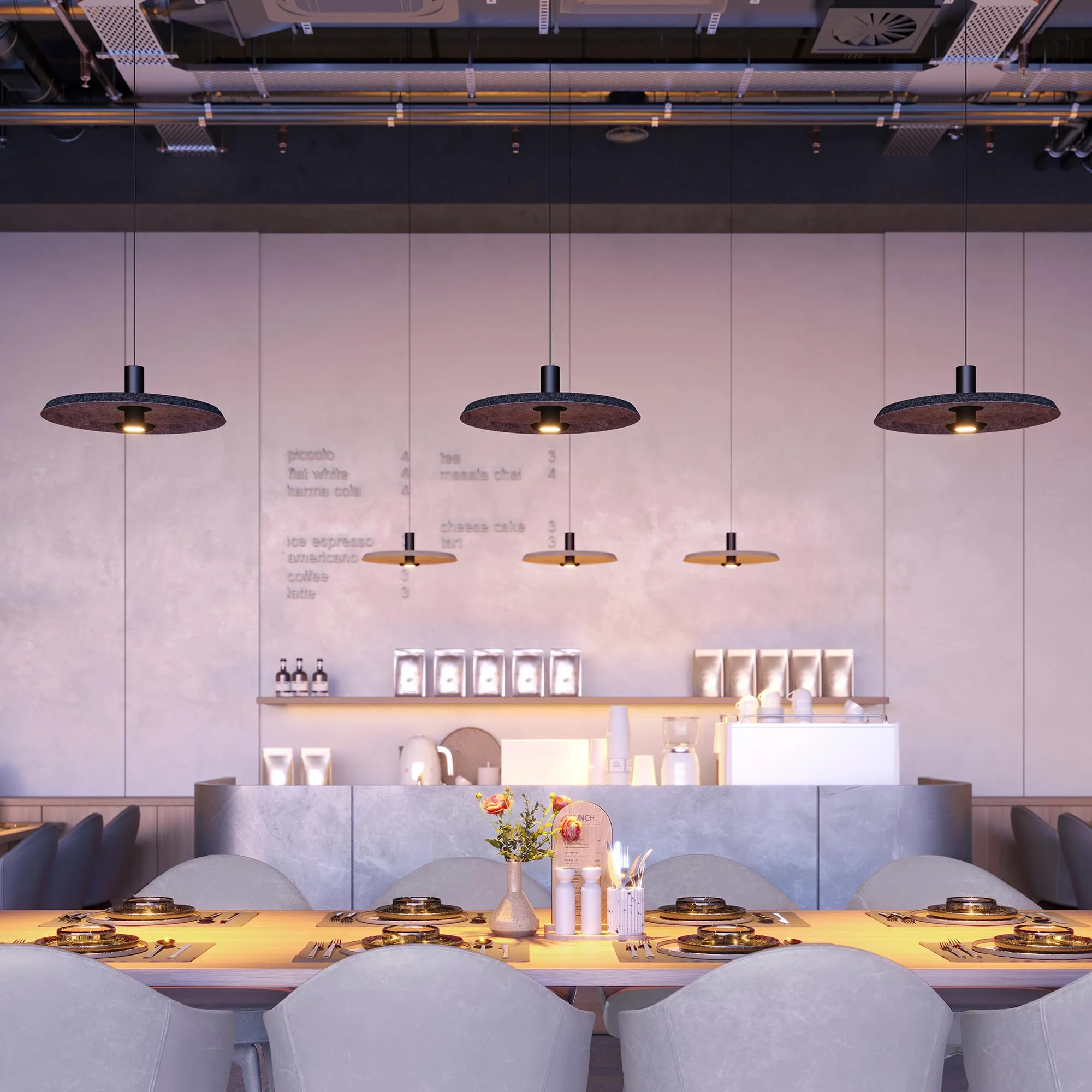 Подвесной светильник. Мощность 12 Вт, св. поток 648 лм, 64 лм/Вт, теплый 2700 K, CRI>94, угол 36°, напряжение питания 230 В. Черный фигурный плафон из переработанного фетра с кофейной внутренней поверхностью, линза-рассеиватель из PMMA, степень защиты IP20. Размер: диаметр 450 мм, высота 145 мм. Монтаж подвесной, длина подвеса 2000 мм, регулируемая. В комплекте 2 вида чаш. Габариты чаши (встраиваемая) Ø80 х 23 мм, врезное отверстие Ø60 мм. Габариты чаши (накладная) Ø120 x 35 мм. Драйвер 59В, 300 мА, пульсация <1%. Управление по TRIAC.