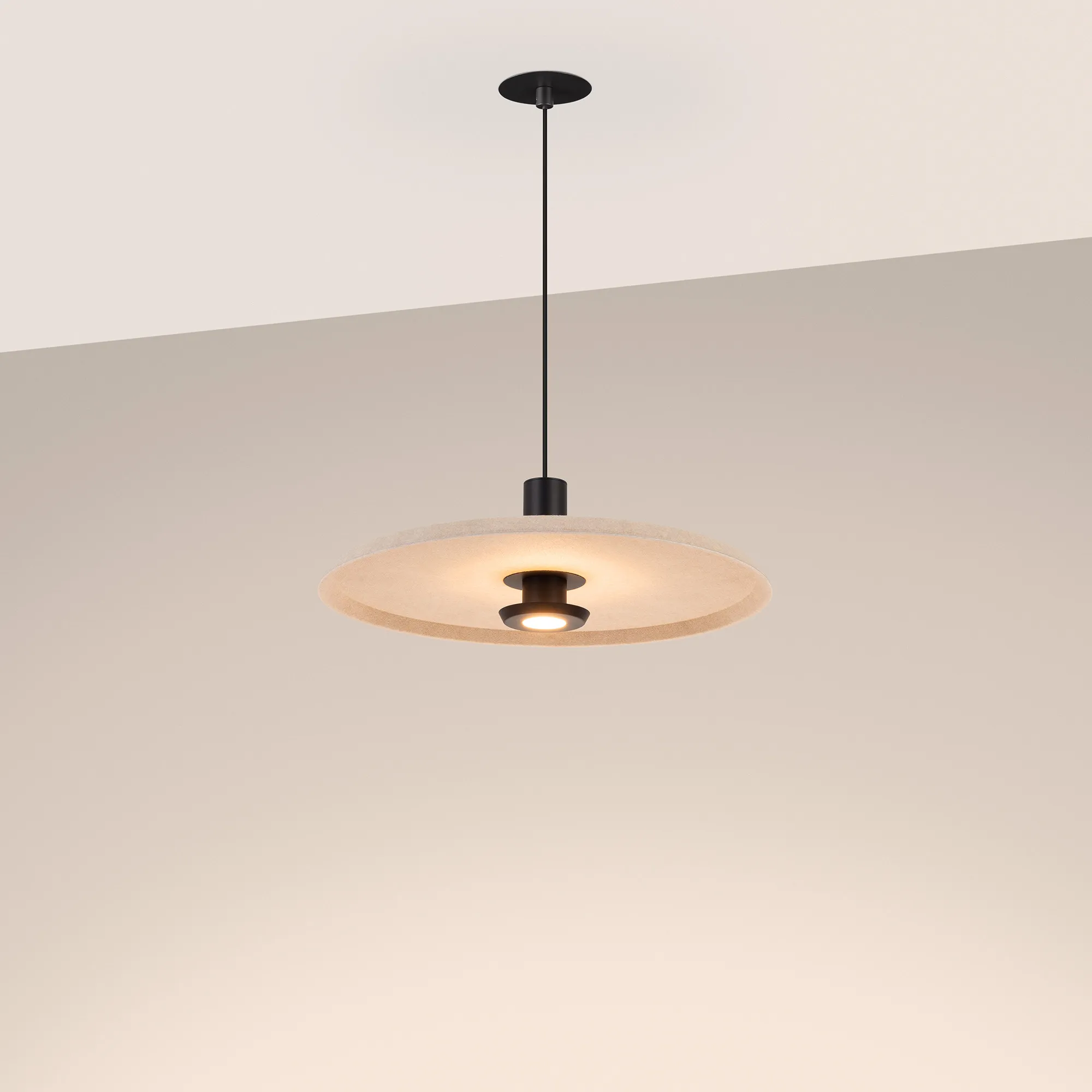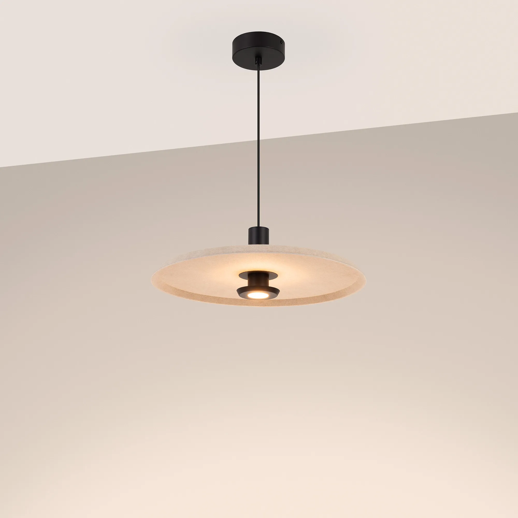 Подвесной светильник. Мощность 12 Вт, св. поток 768 лм, 64 лм/Вт, теплый 3000 K, CRI>94, угол 36°, напряжение питания 230 В. Бежевый фигурный плафон из переработанного фетра с кофейной внутренней поверхностью, линза-рассеиватель из PMMA, степень защиты IP20. Размер: диаметр 450 мм, высота 145 мм. Монтаж подвесной, длина подвеса 2000 мм, регулируемая. В комплекте 2 вида чаш. Габариты чаши (встраиваемая) Ø80 х 23 мм, врезное отверстие Ø60 мм. Габариты чаши (накладная) Ø120 x 35 мм. Драйвер 59В, 300 мА, пульсация <1%. Управление по TRIAC.