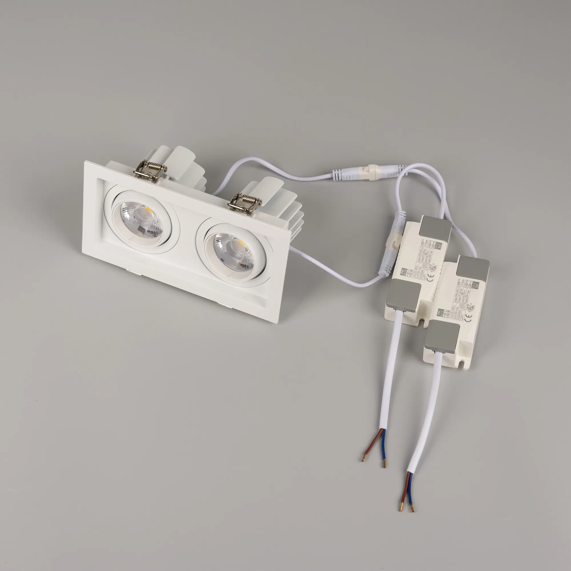 Встраиваемый карданный светильник. Мощность 2х12 Вт, св. поток 2636 лм, 109 лм/Вт, дневной 4000 K, CRI>92, угол 20°, напряжение питания 230 В. Белый корпус из алюминия, белая вставка, степень защиты IP20. Размер: длина 170 мм, ширина 90 мм, высота 80 мм. Монтаж встраиваемый, установочное отверстие: длина 155 мм, ширина 75 мм. Драйвер 27-40 В, 300 мА, пульсация <2%.
